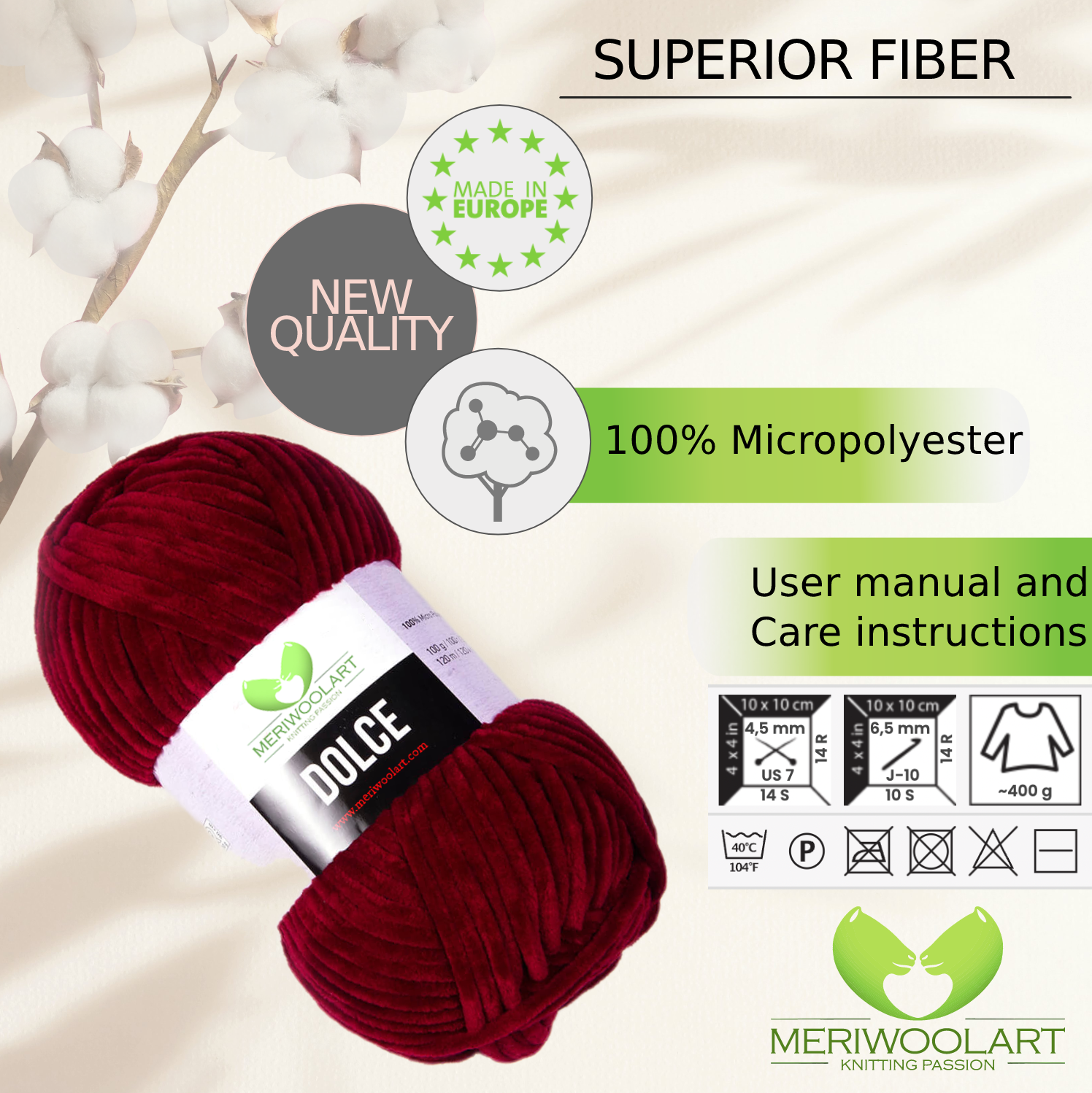 - Chenille yarns with 100% polyester fiber. The thick Velvet yarn have a velvety feel due to their micropolyester content.