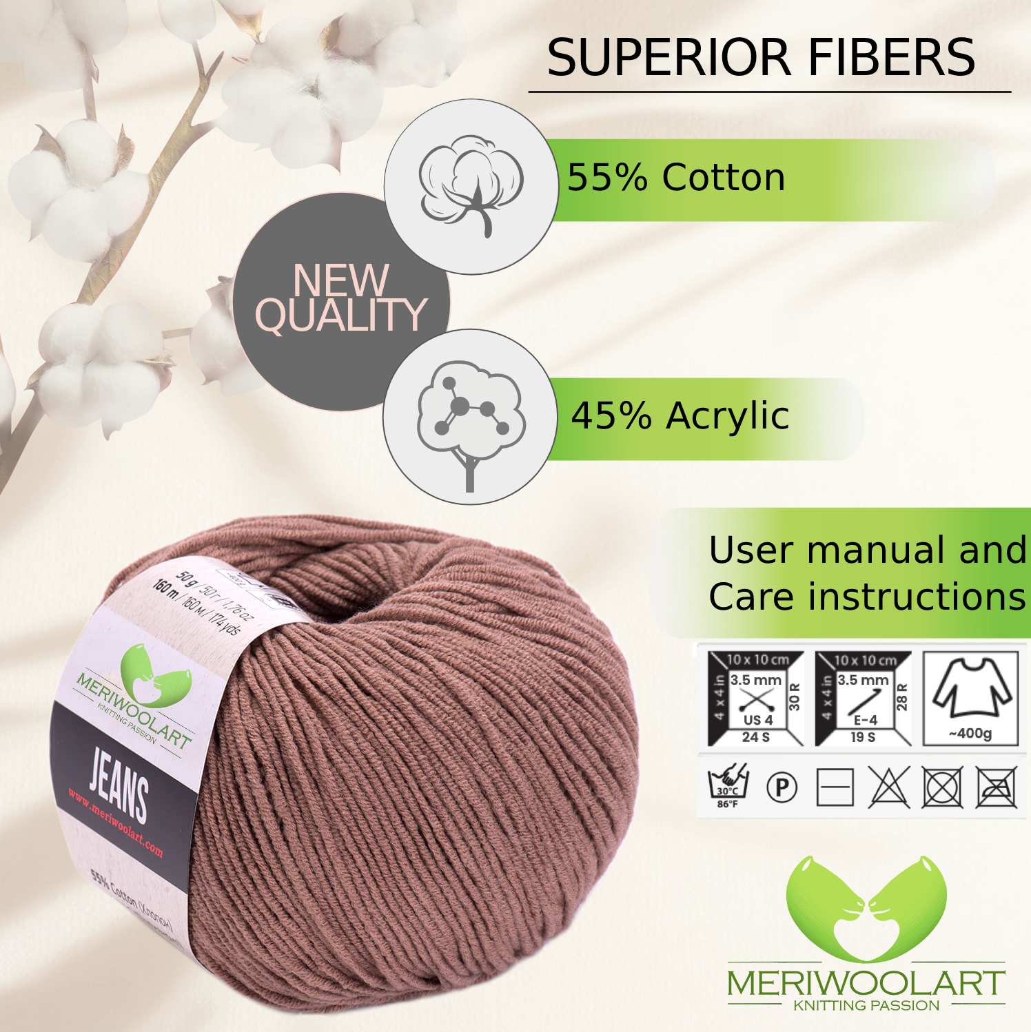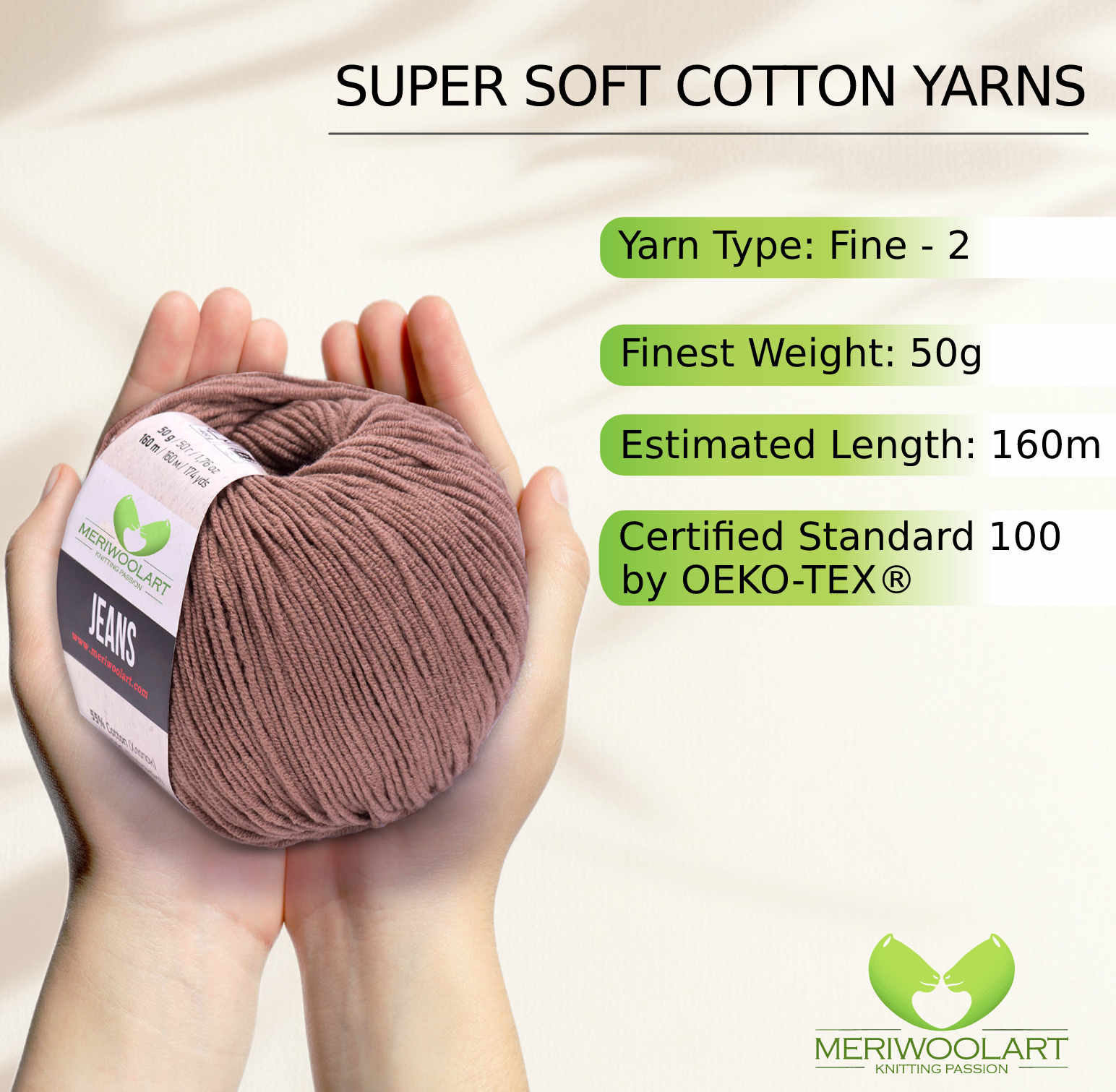 Experience the softness and versatility of MeriWoolArt® Natural Cotton Yarn, perfect for knitting, crocheting, and crafting baby clothes, blankets, and accessories.