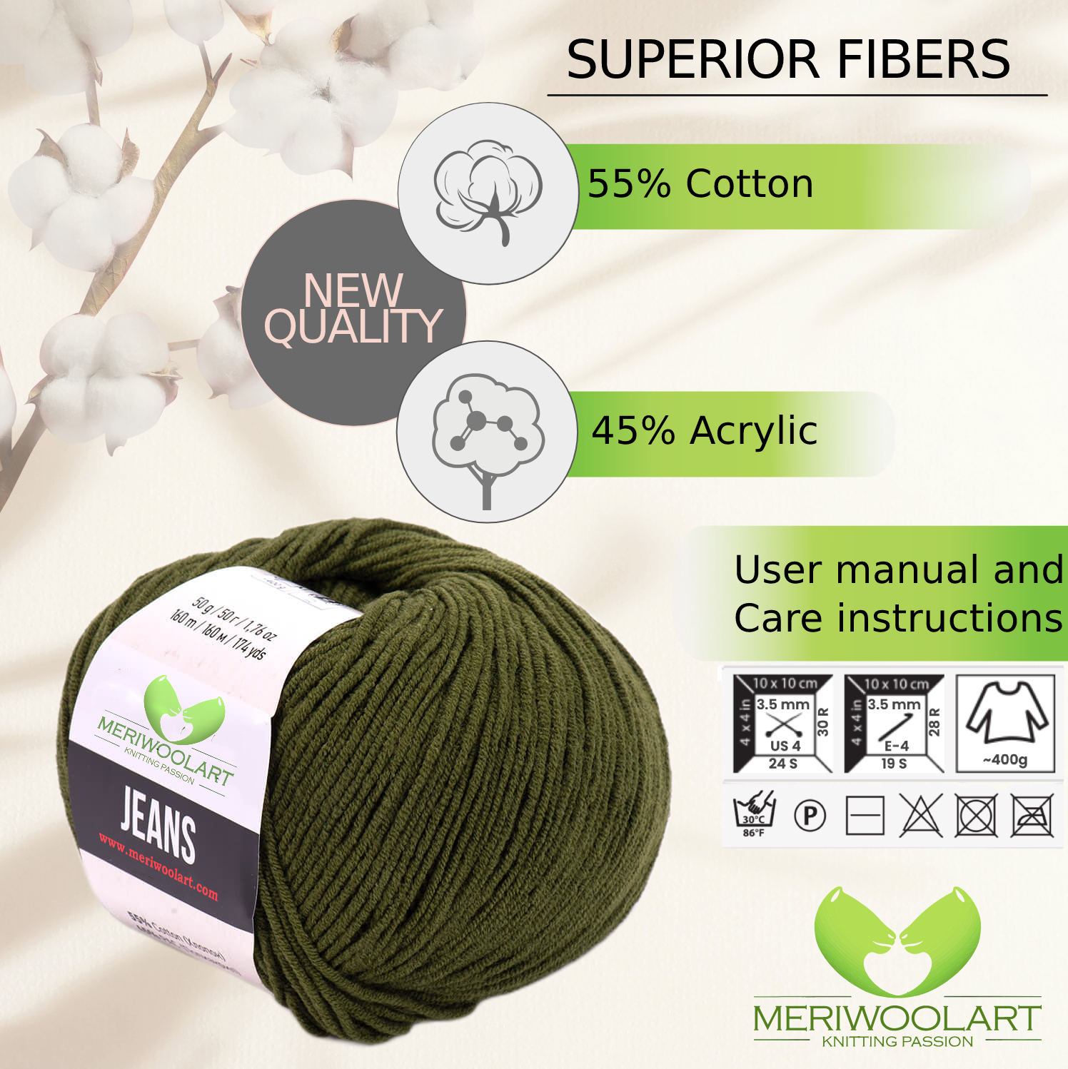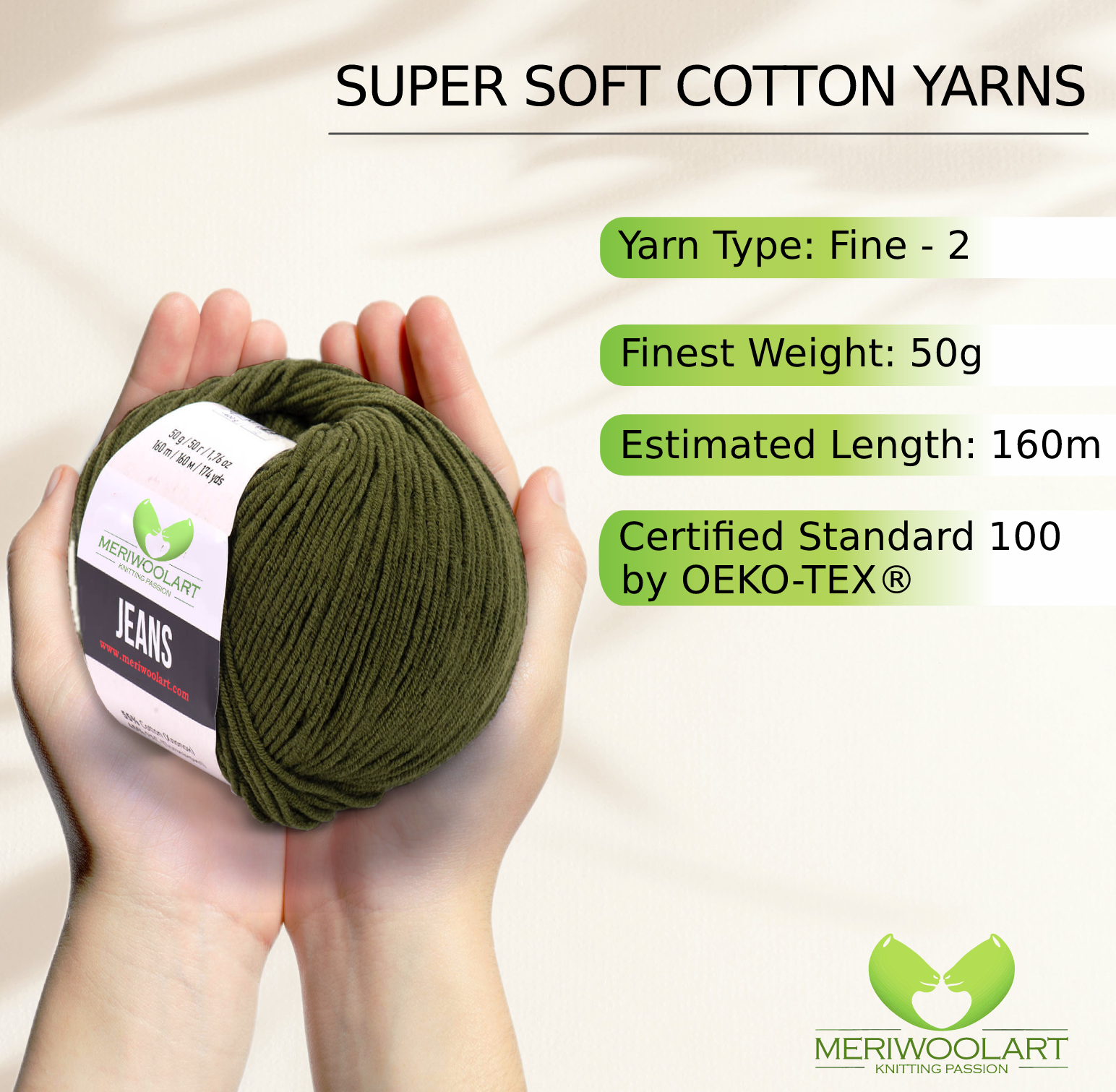 Experience the softness and versatility of MeriWoolArt® Natural Cotton Yarn, perfect for knitting, crocheting, and crafting baby clothes, blankets, and accessories.