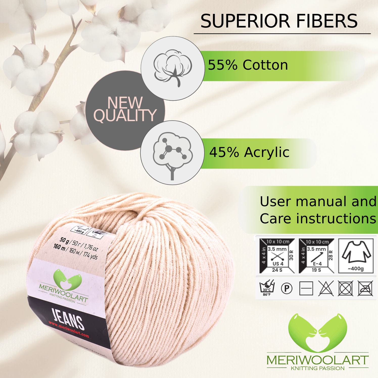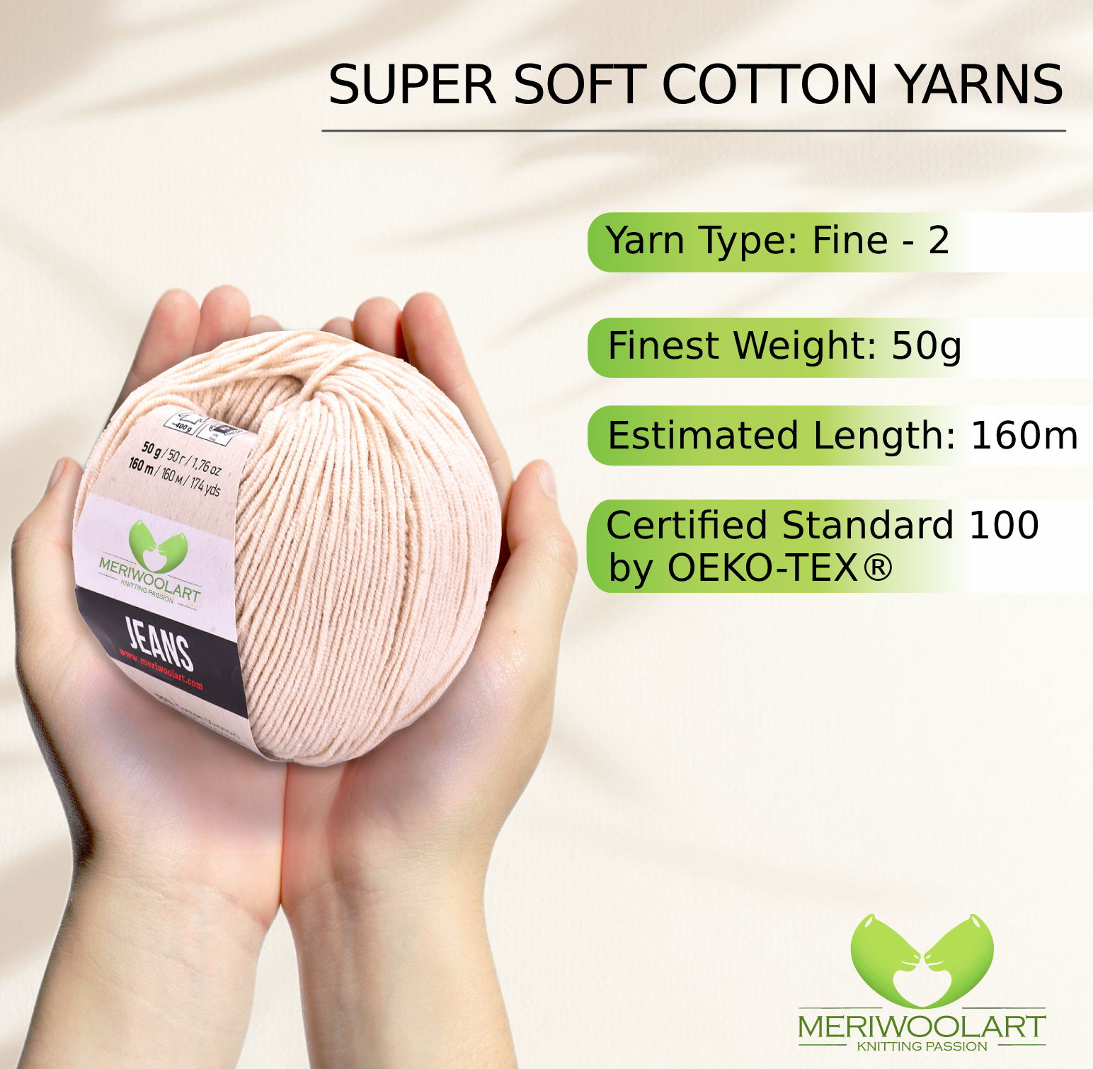 Experience the softness and versatility of MeriWoolArt® Natural Cotton Yarn, perfect for knitting, crocheting, and crafting baby clothes, blankets, and accessories.