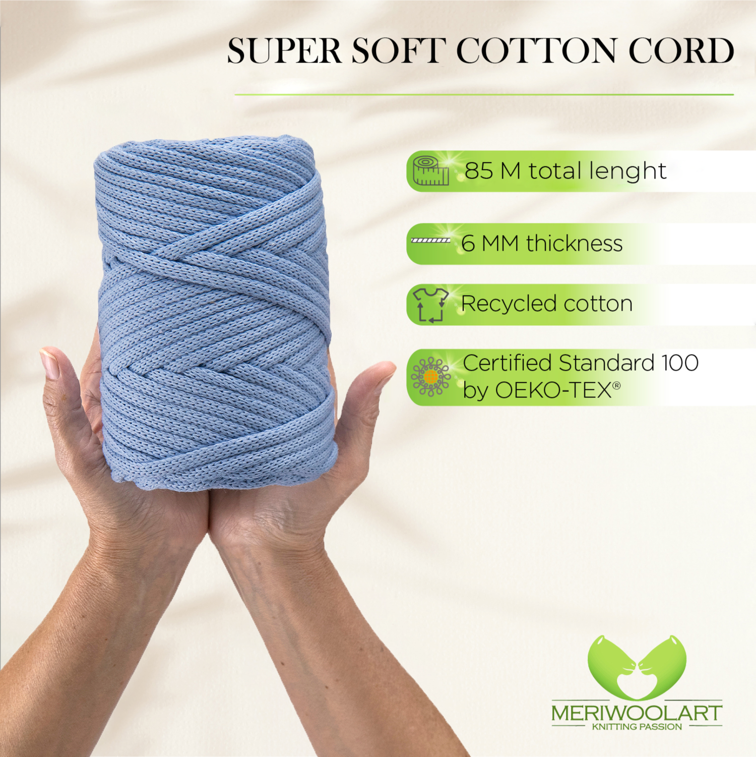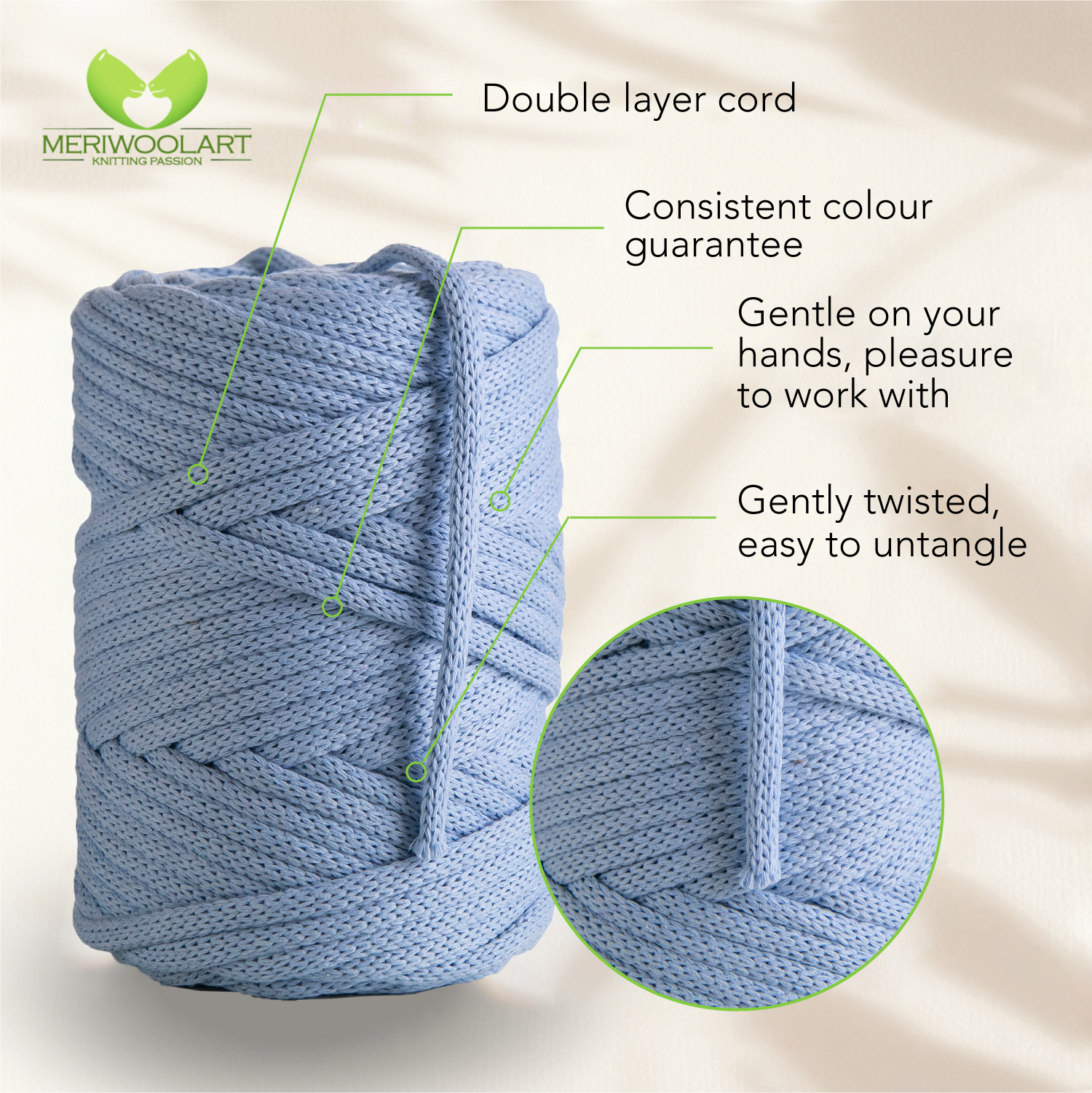 - Perfect for large projects, like a crochet bag or macramé pillow. The thick cord is made of two layers, making it durable, elastic and sustainable.