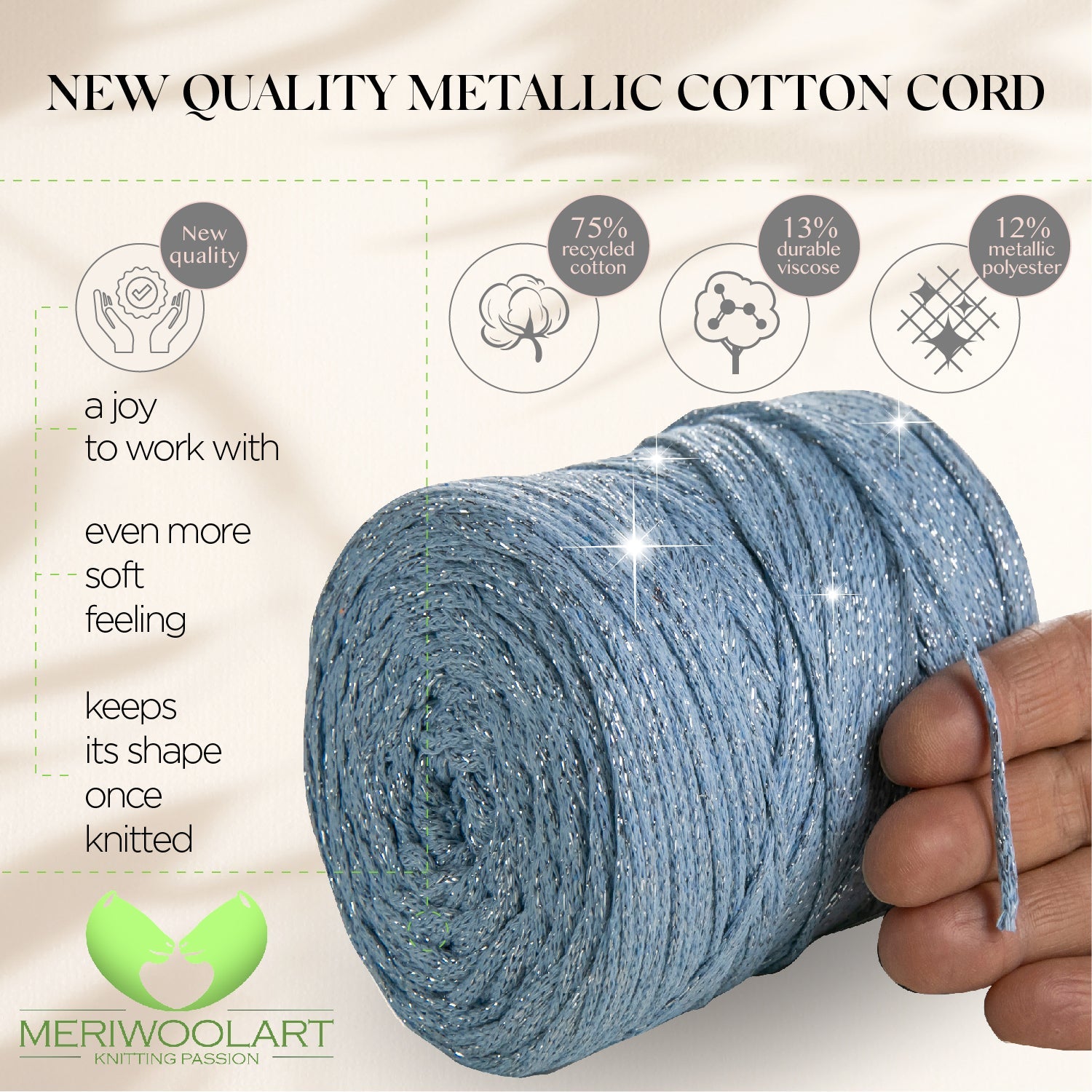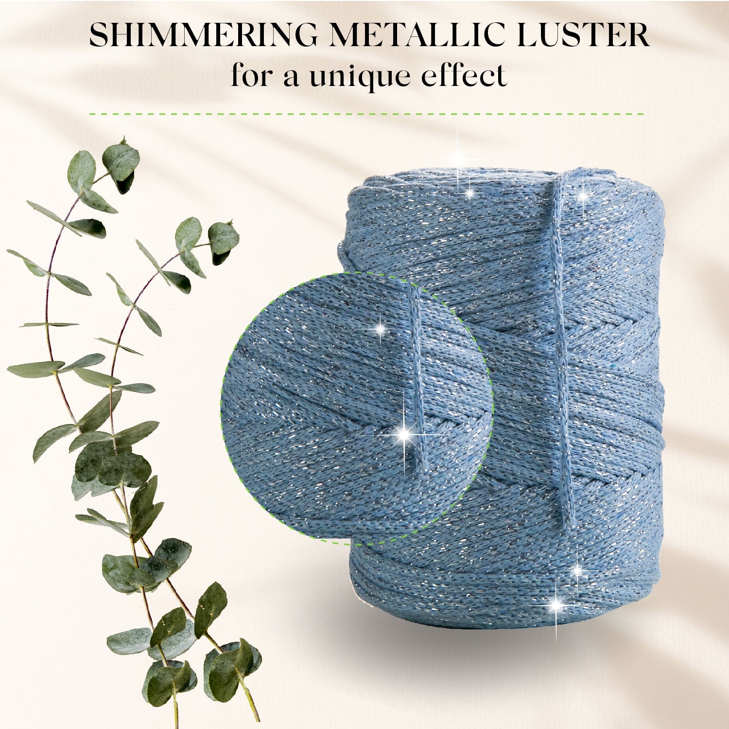 - Macramé bead string with glittering effect. Although it contains a metallic thread, the ropes with this luxury yarn are very soft and lush.