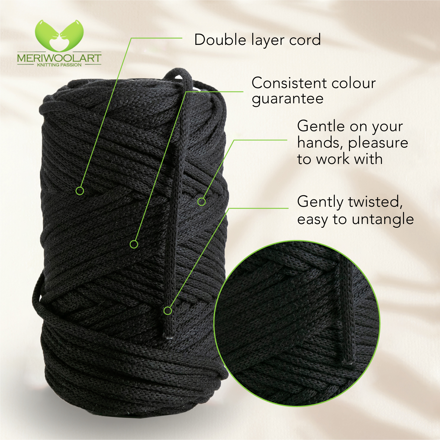 - Perfect for large projects, like a crochet bag or macramé pillow. The thick cord is made of two layers, making it durable, elastic and sustainable.