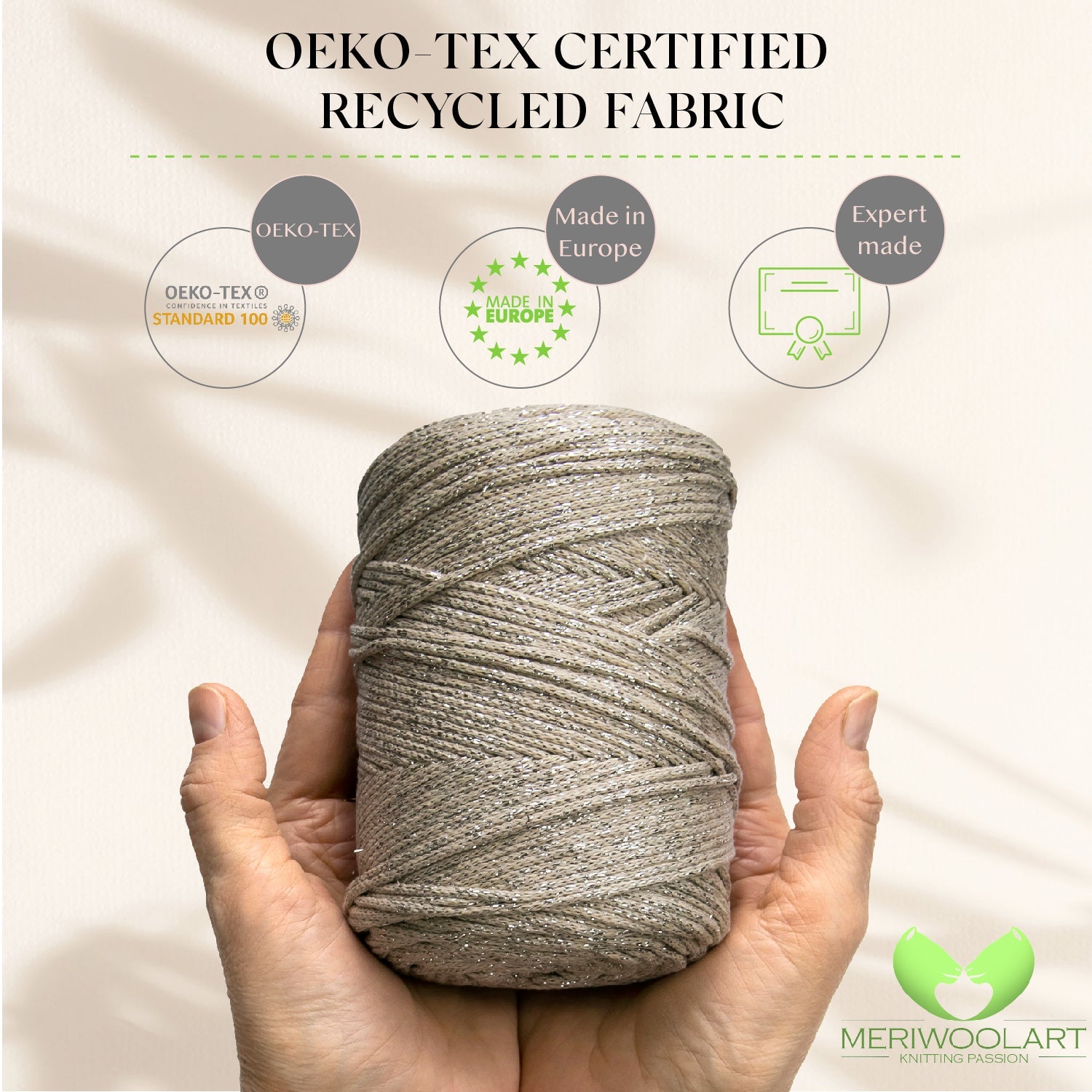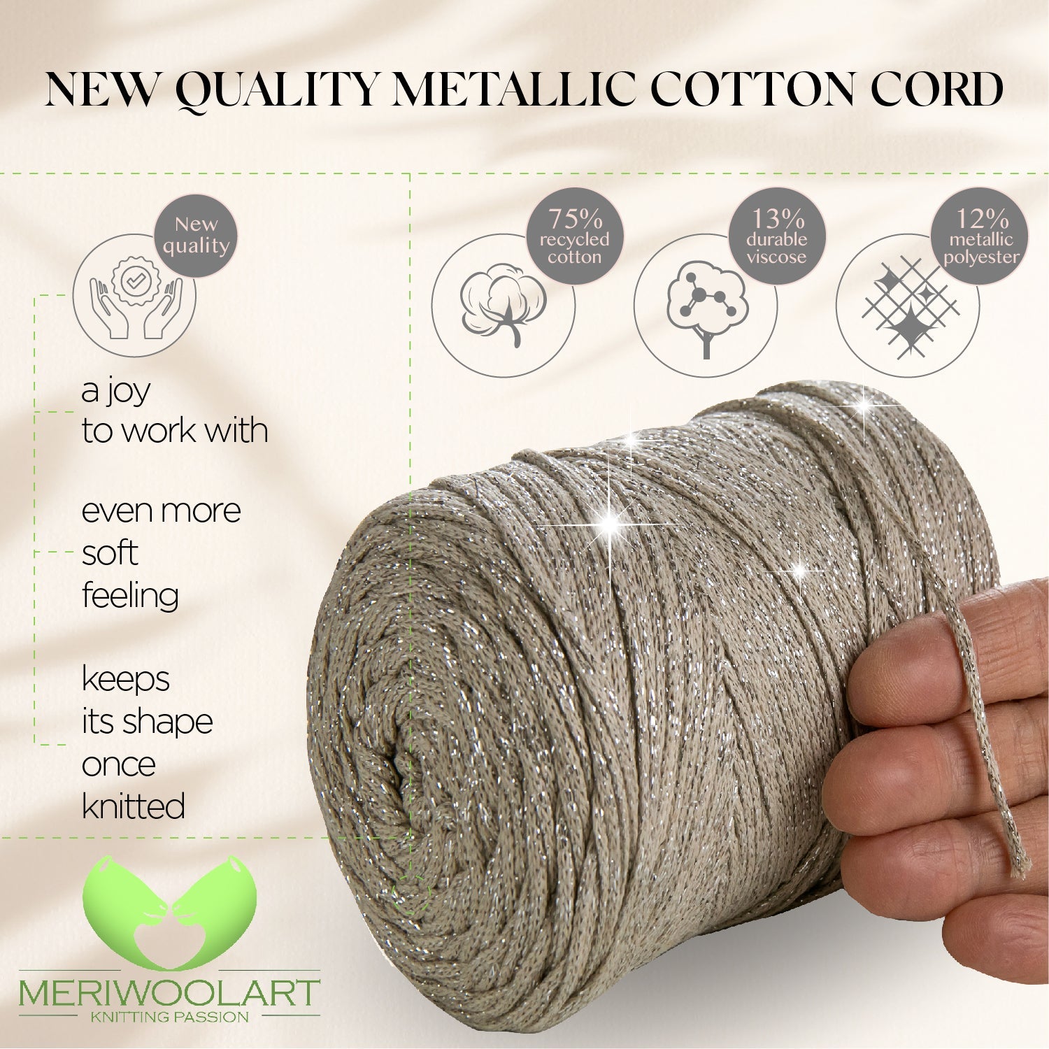 - Macramé bead string with glittering effect. Although it contains a metallic thread, the ropes with this luxury yarn are very soft and lush.