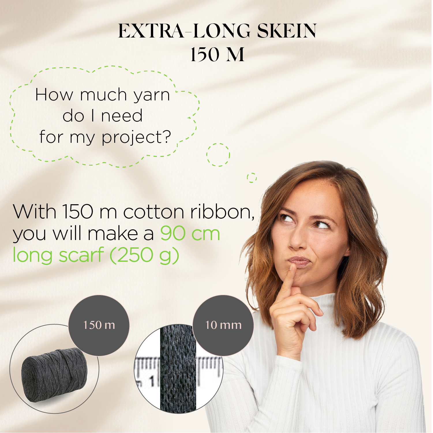 - Extra long strand 150 m cotton T-Shirt yarn.