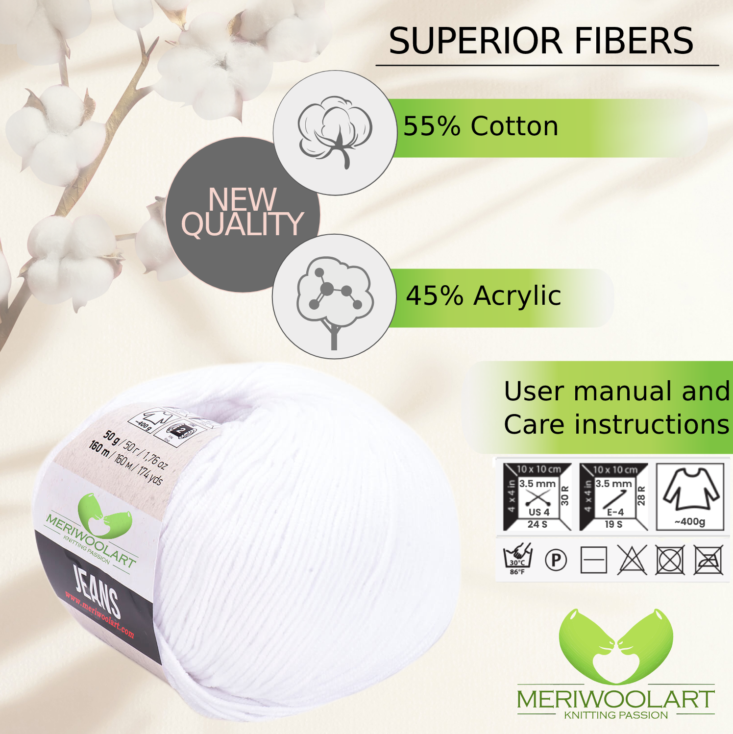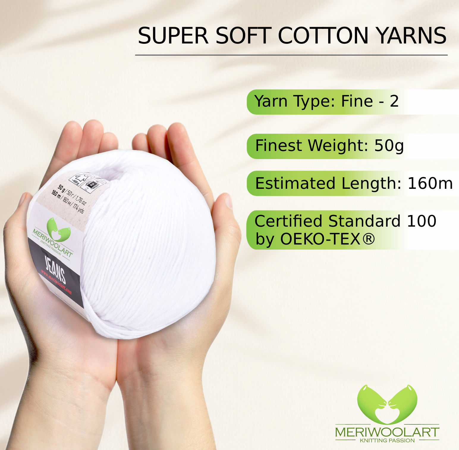 Experience the softness and versatility of MeriWoolArt® Natural Cotton Yarn, perfect for knitting, crocheting, and crafting baby clothes, blankets, and accessories.