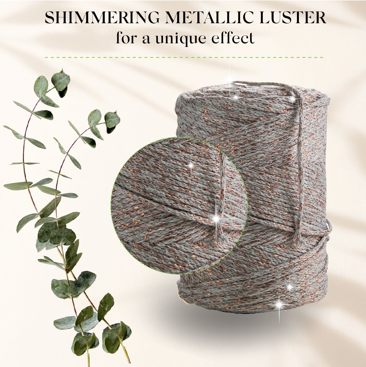 - Macramé bead string with glittering effect. Although it contains a metallic thread, the ropes with this luxury yarn are very soft and lush.