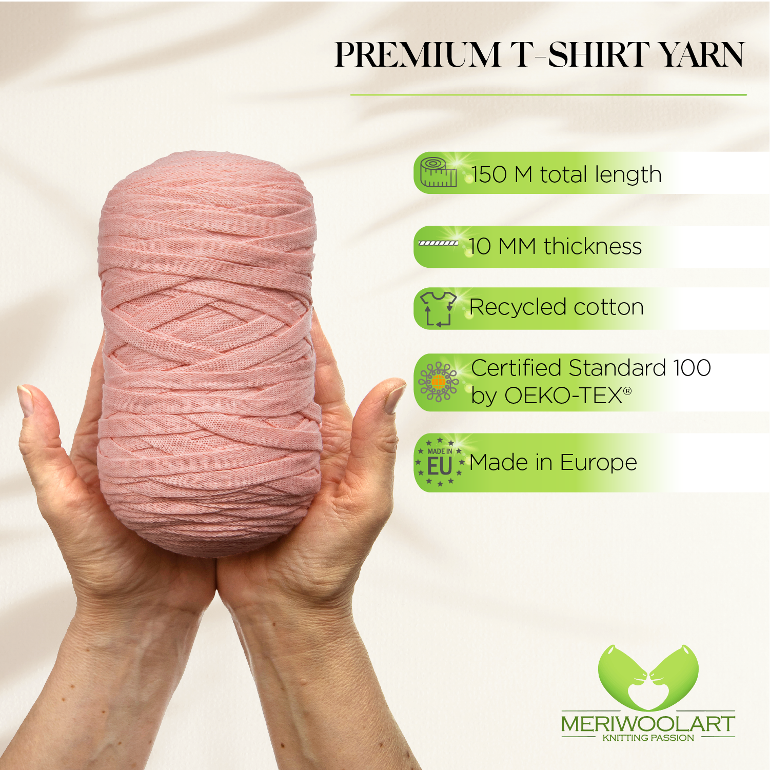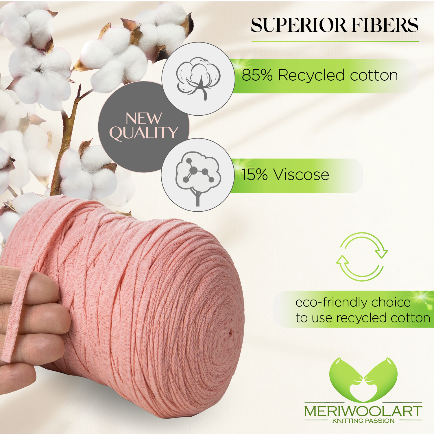- MeriWoolArt T-shirt yarn for crocheting, knitting and macrame is gentle and easy to work with thanks to the special blend - recycled cotton yarn (85%) and durable viscose (15%).