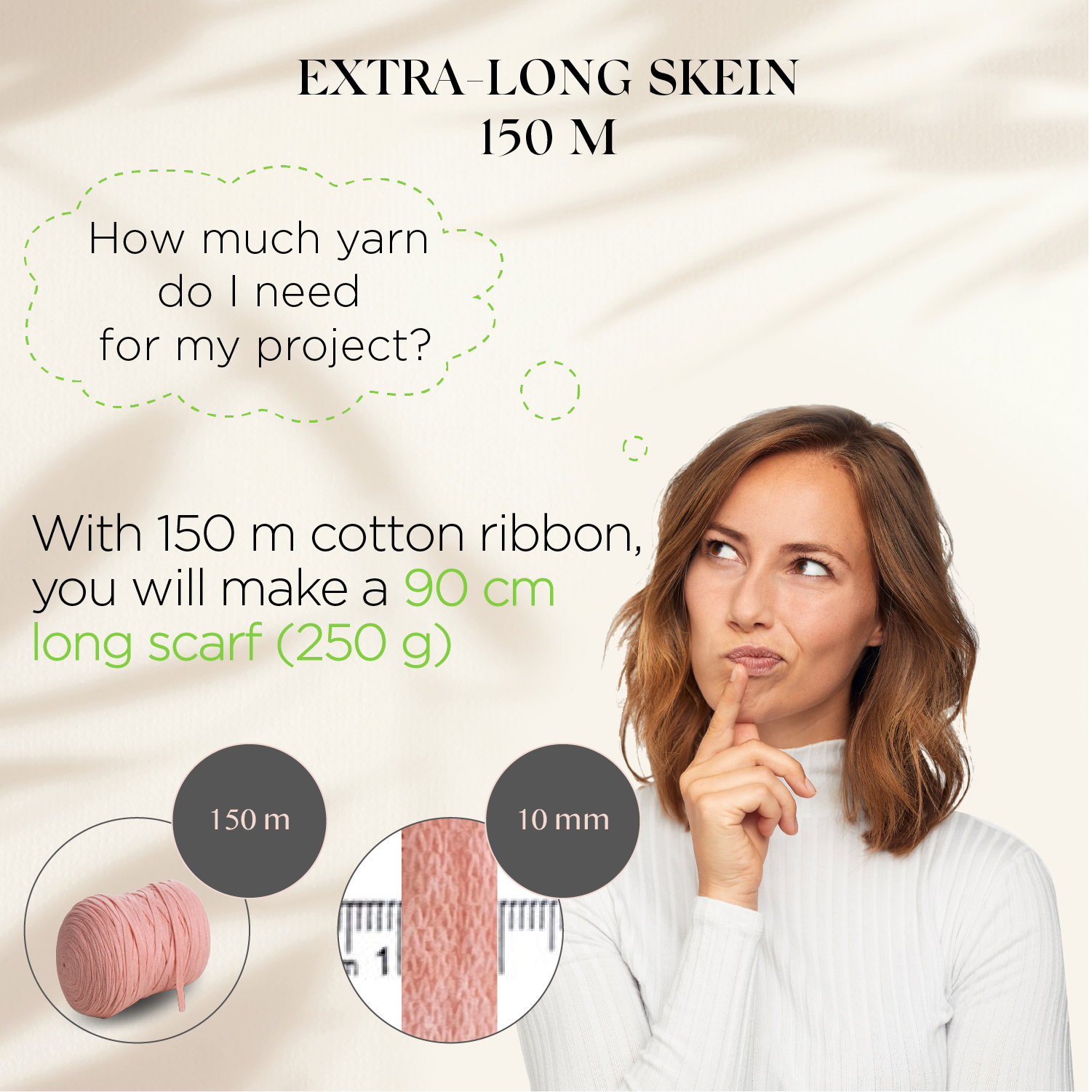 - Extra long strand 150 m cotton T-Shirt yarn.