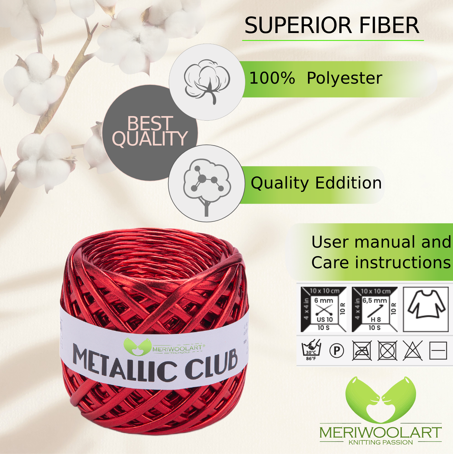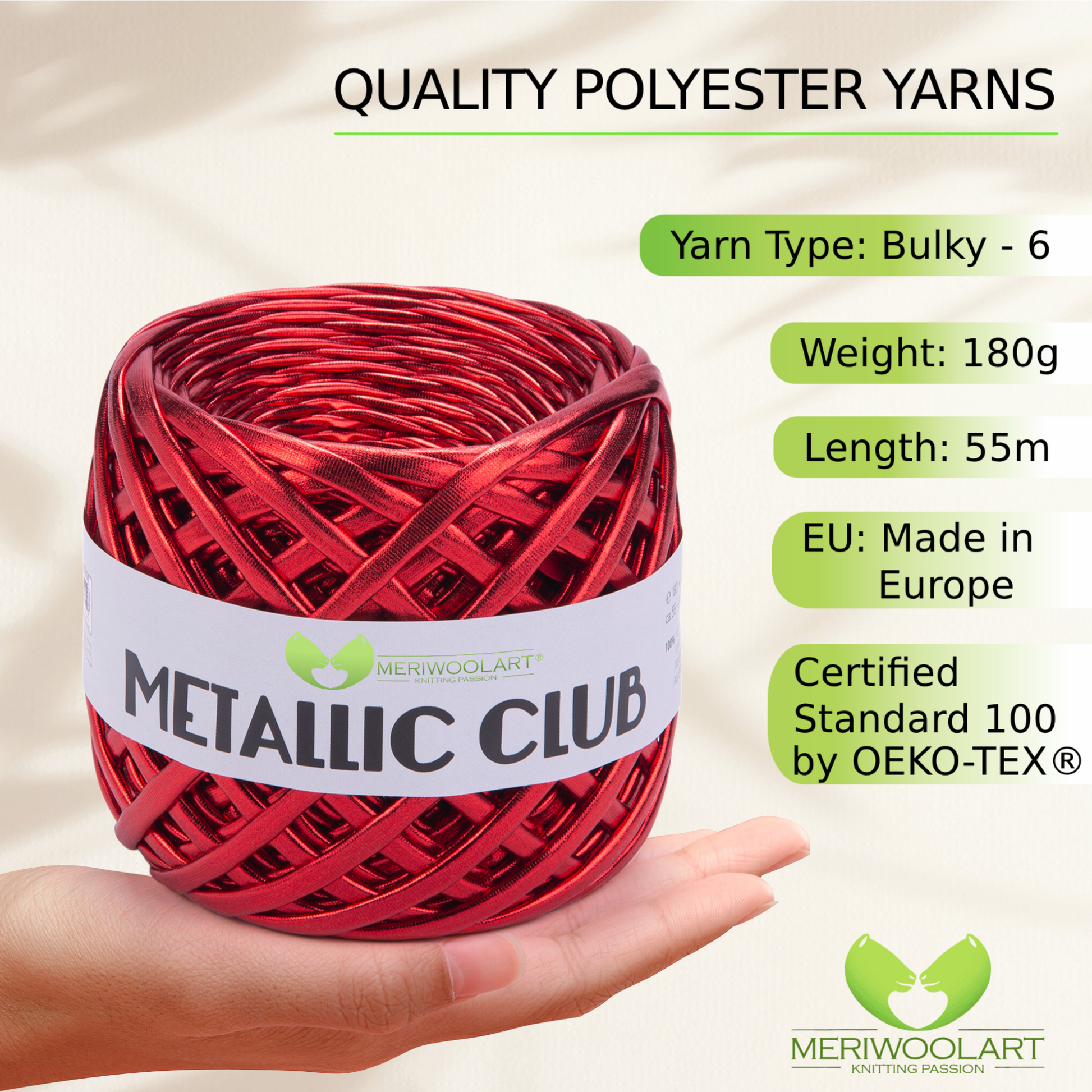 Experience the luxurious feel of MeriWoolArt® Premium Metallic T-Shirt Yarn, perfect for knitting, crocheting, and creating stylish accessories.