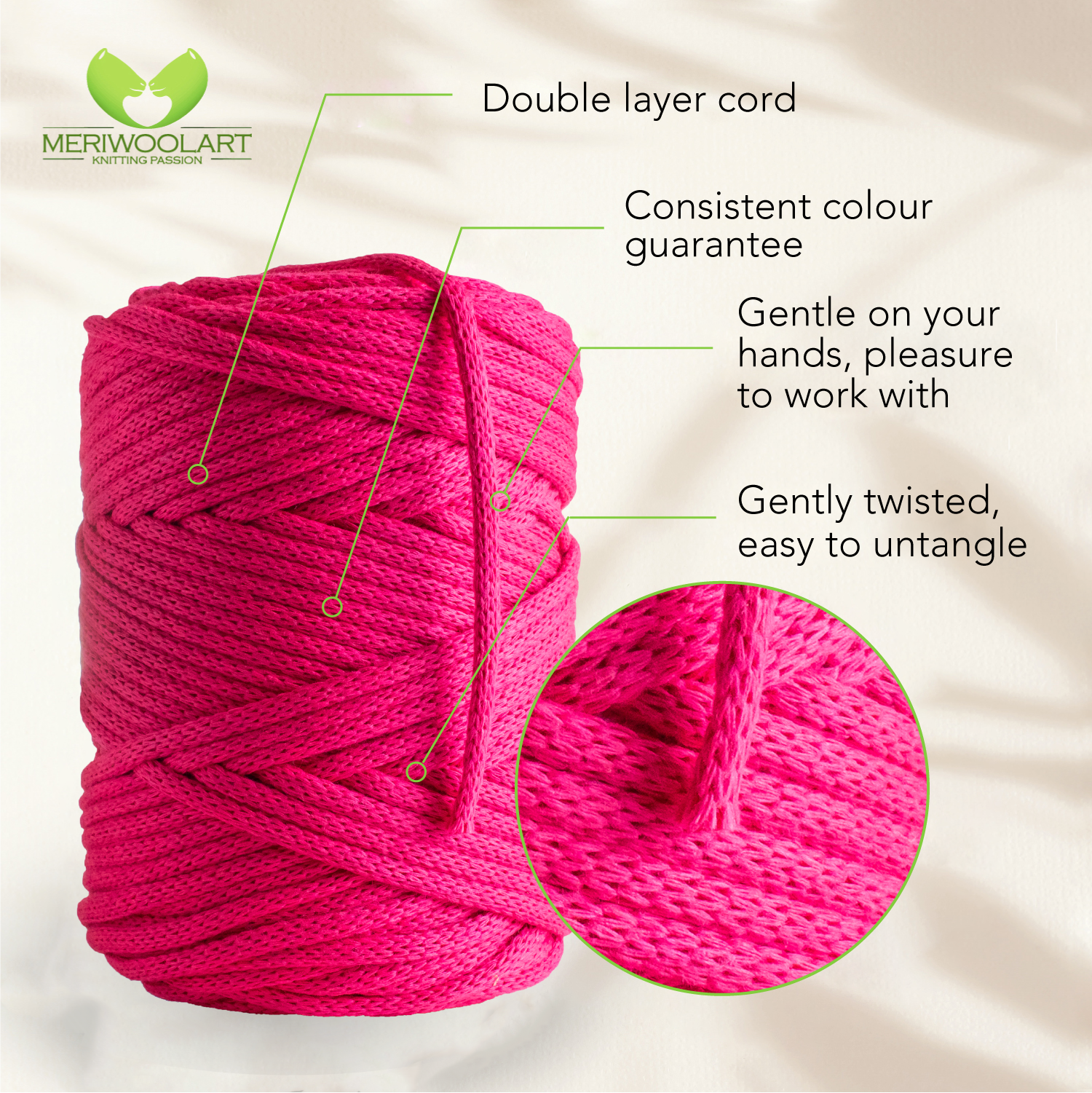 - Perfect for large projects, like a crochet bag or macramé pillow. The thick cord is made of two layers, making it durable, elastic and sustainable.