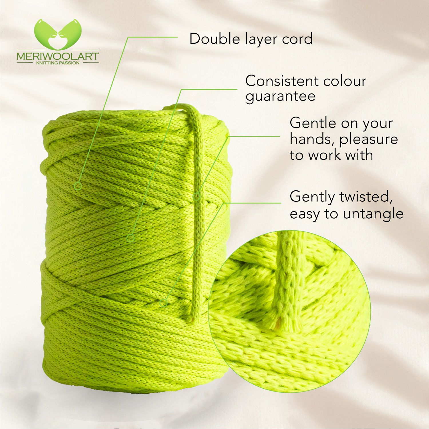 - Perfect for large projects, like a crochet bag or macramé pillow. The thick cord is made of two layers, making it durable, elastic and sustainable.