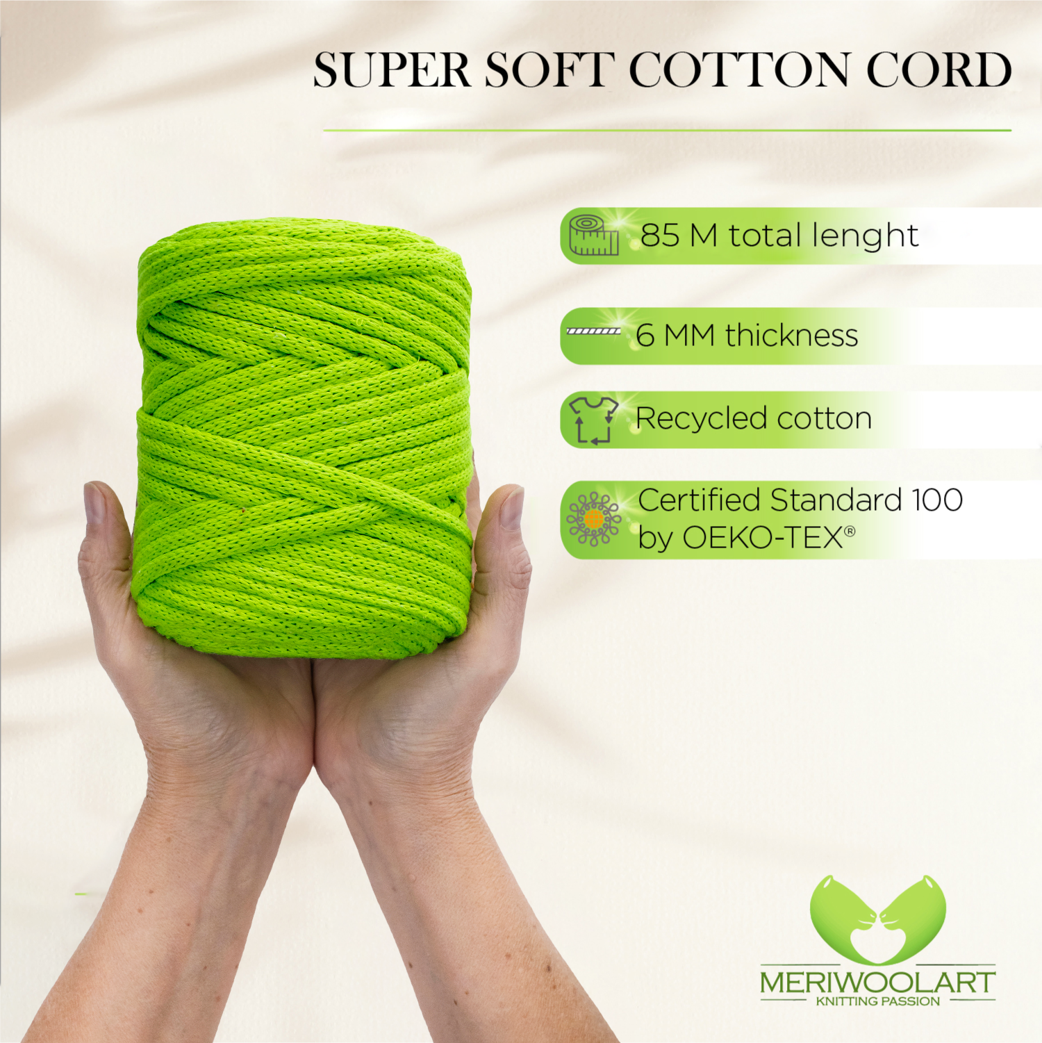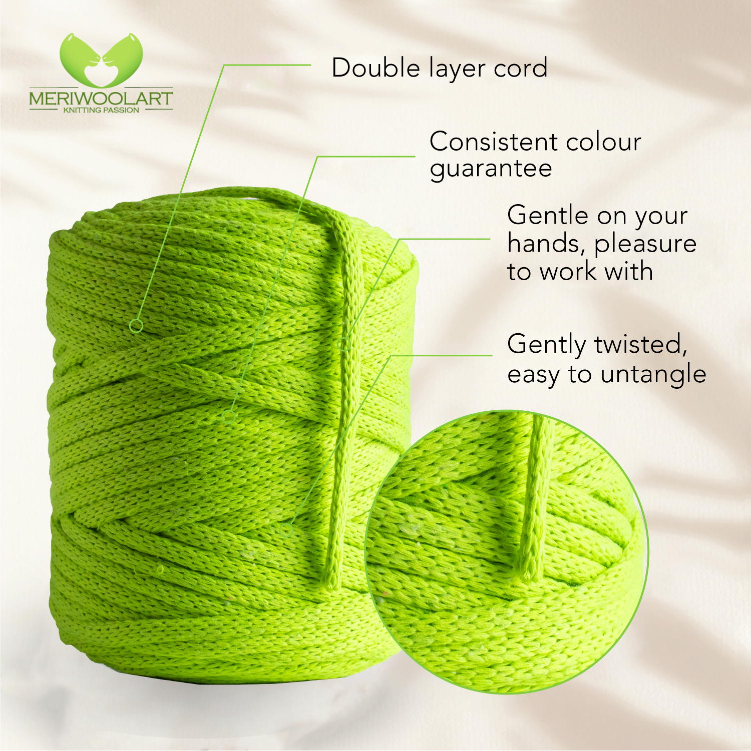 - Perfect for large projects, like a crochet bag or macramé pillow. The thick cord is made of two layers, making it durable, elastic and sustainable.