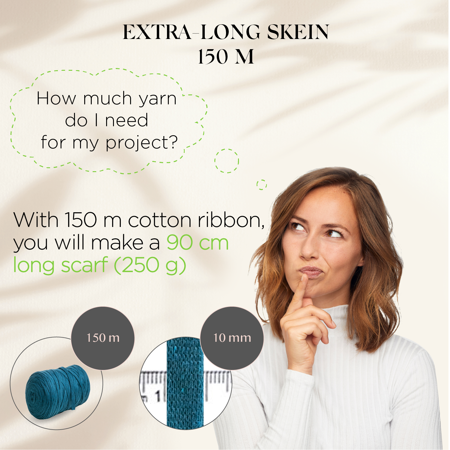 - Extra long strand 150 m cotton T-Shirt yarn.