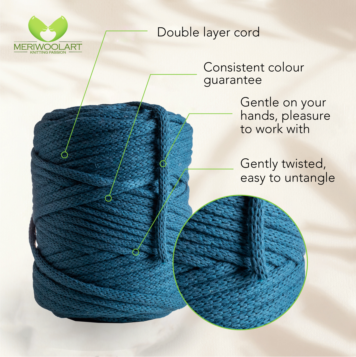 - Perfect for large projects, like a crochet bag or macramé pillow. The thick cord is made of two layers, making it durable, elastic and sustainable.