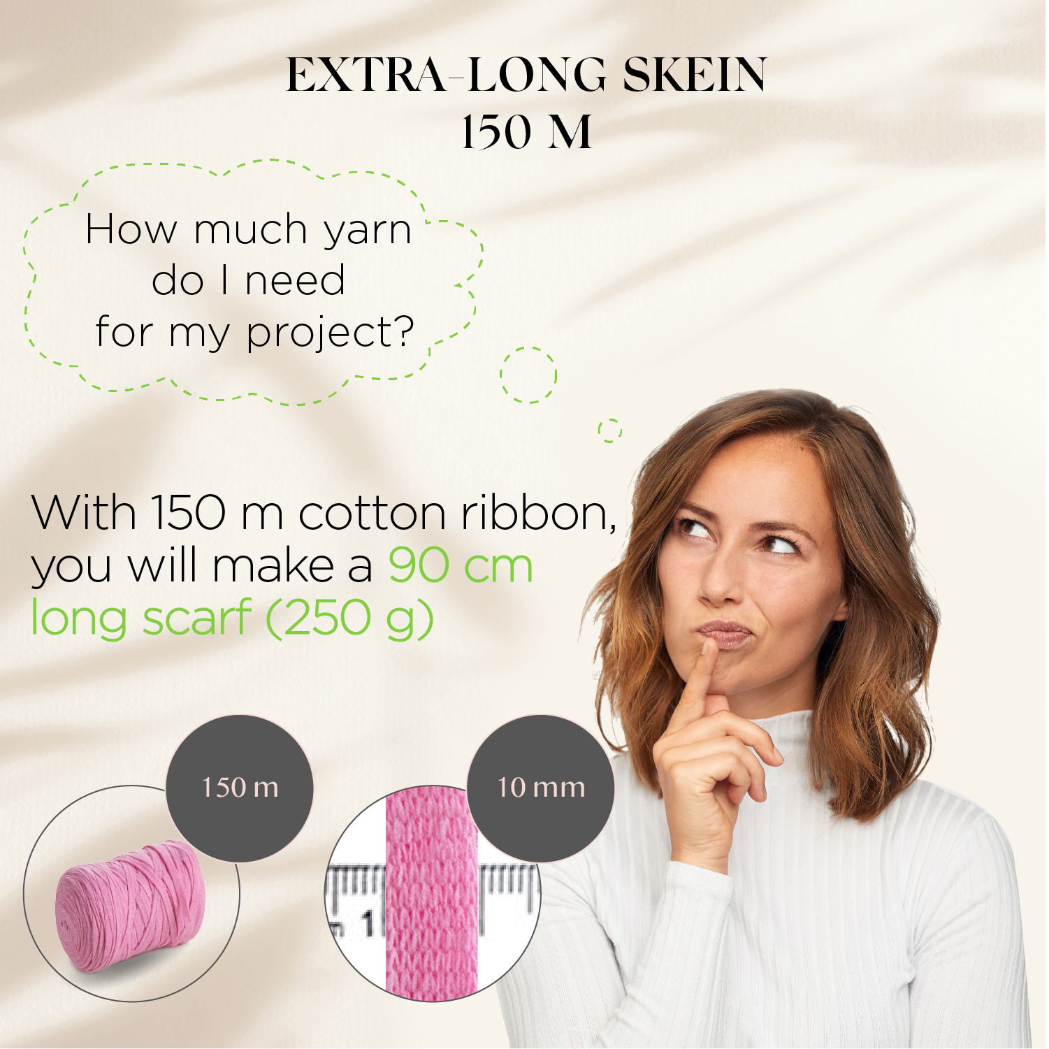 - Extra long strand 150 m cotton T-Shirt yarn.
