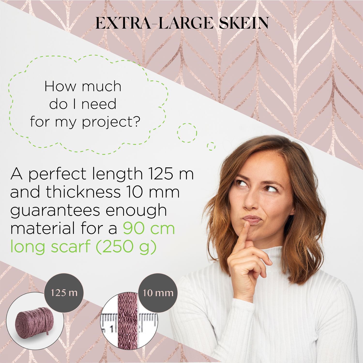 - A perfect length of 125 m of 10 mm thick cotton lurex ribbon guarantees enough material for a 90 cm long scarf (250 g).