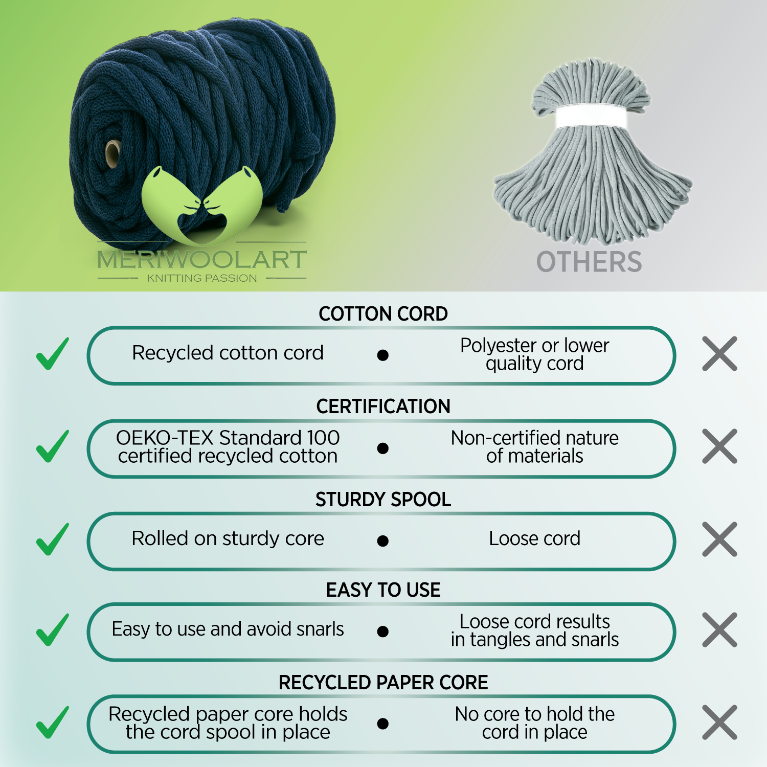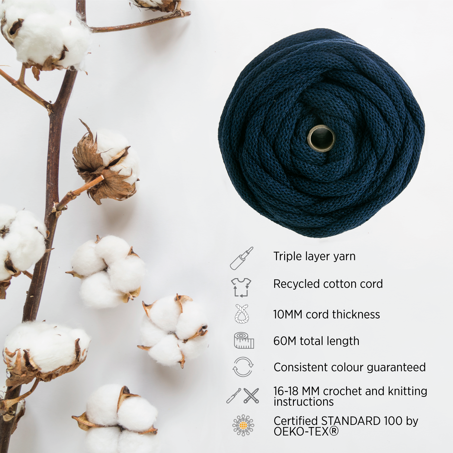 - Think green and choose our Eco-friendly recycled cotton cord.