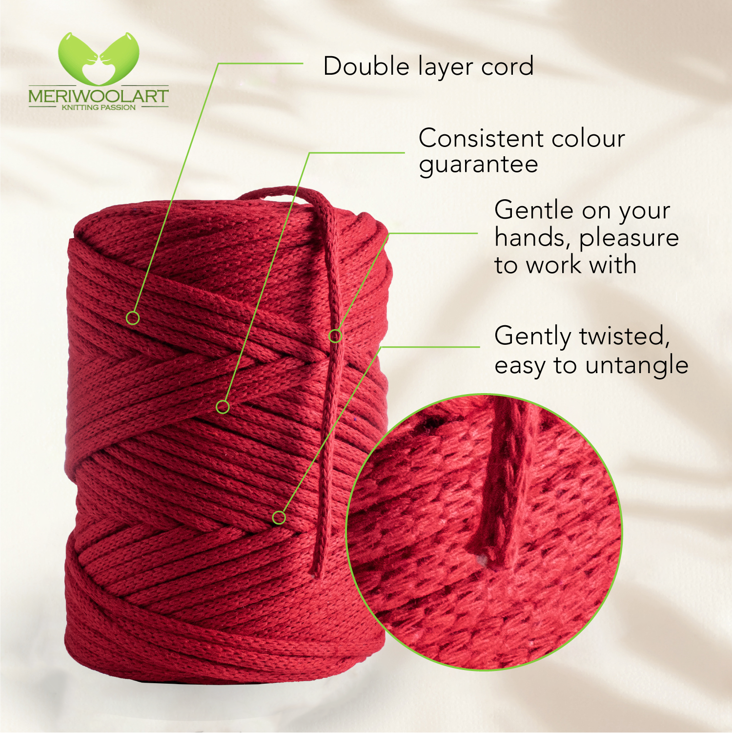 - Perfect for large projects, like a crochet bag or macramé pillow. The thick cord is made of two layers, making it durable, elastic and sustainable.