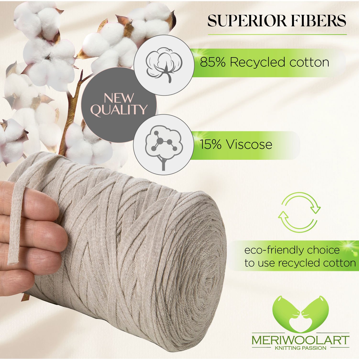 - MeriWoolArt T-shirt yarn for crocheting, knitting and macrame is gentle and easy to work with thanks to the special blend - recycled cotton yarn (85%) and durable viscose (15%).