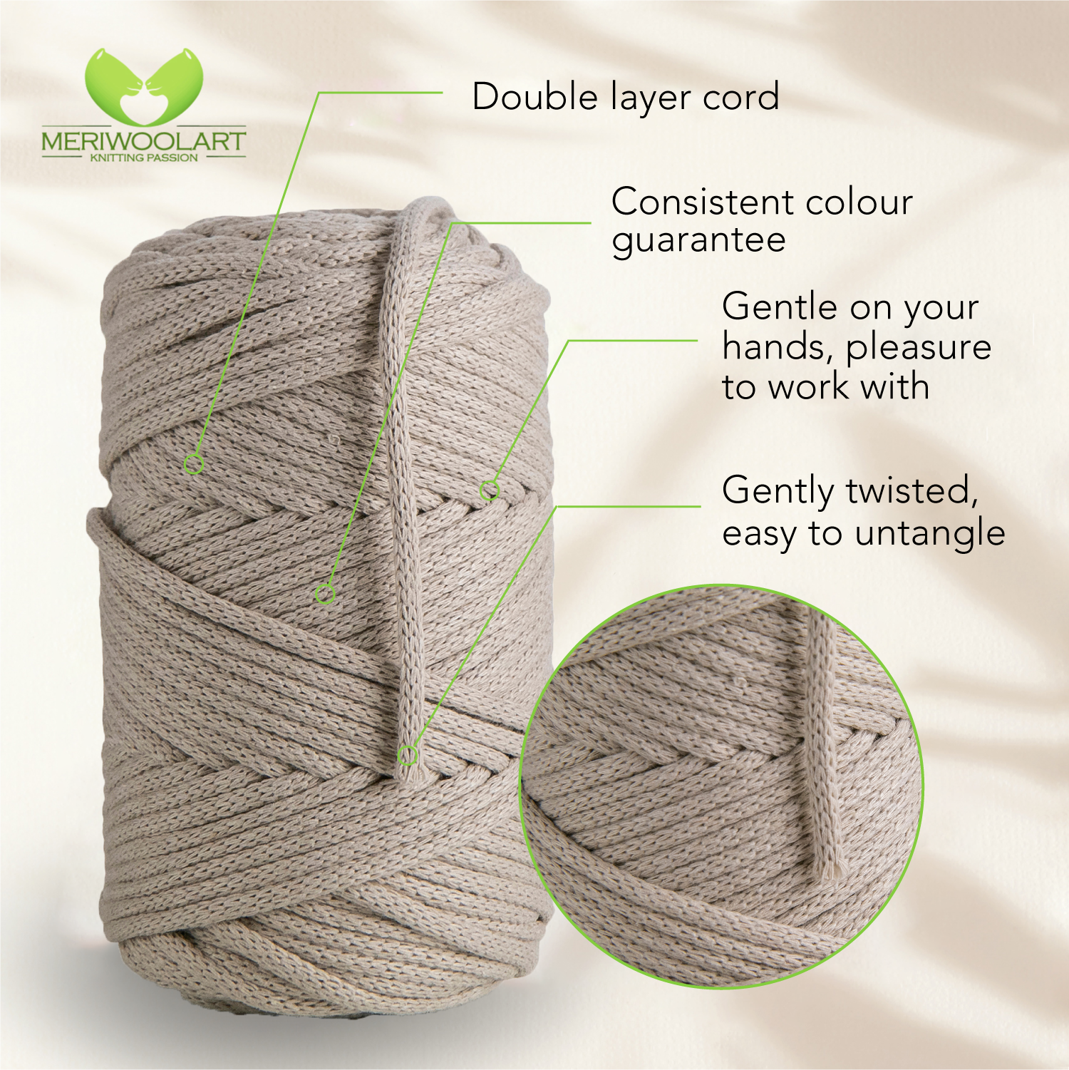 - Perfect for large projects, like a crochet bag or macramé pillow. The thick cord is made of two layers, making it durable, elastic and sustainable.
