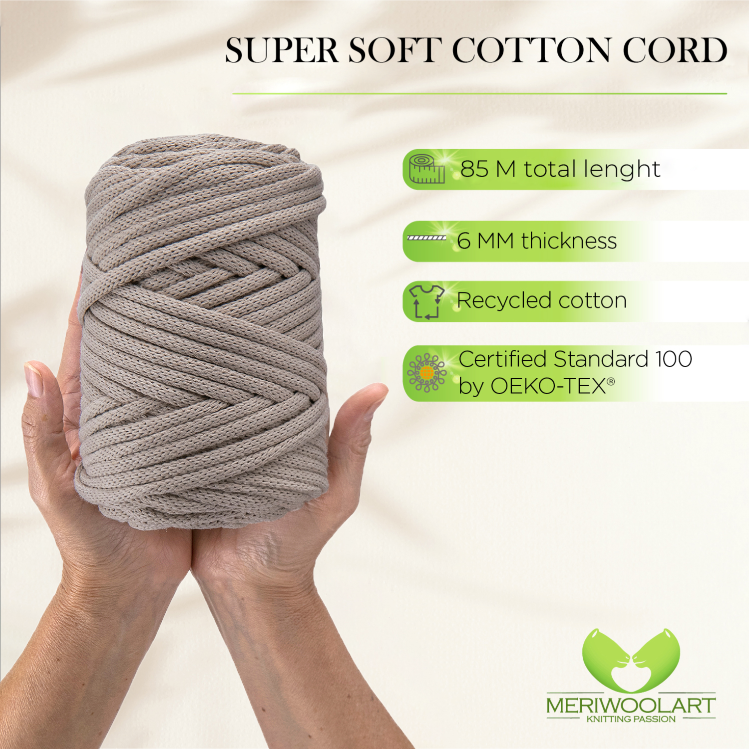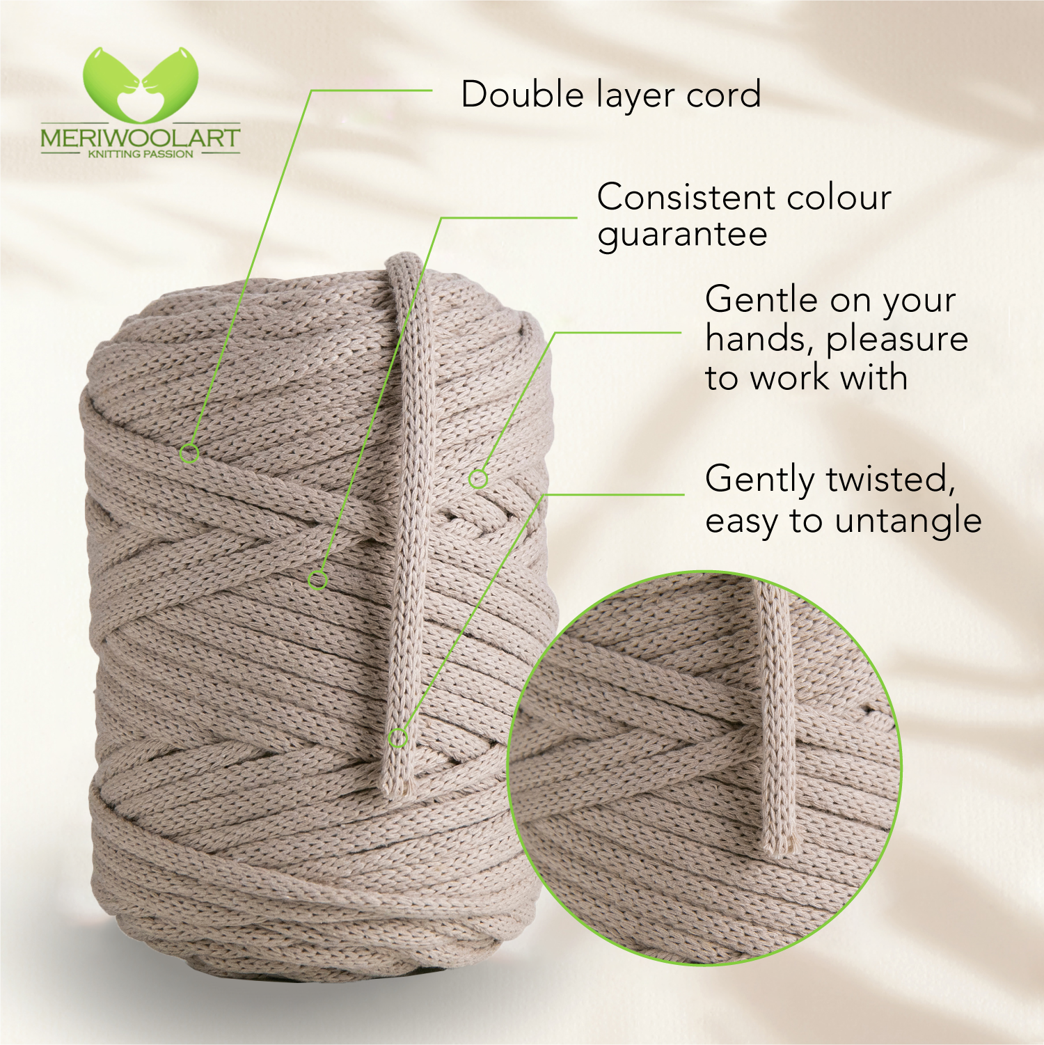 - Perfect for large projects, like a crochet bag or macramé pillow. The thick cord is made of two layers, making it durable, elastic and sustainable.