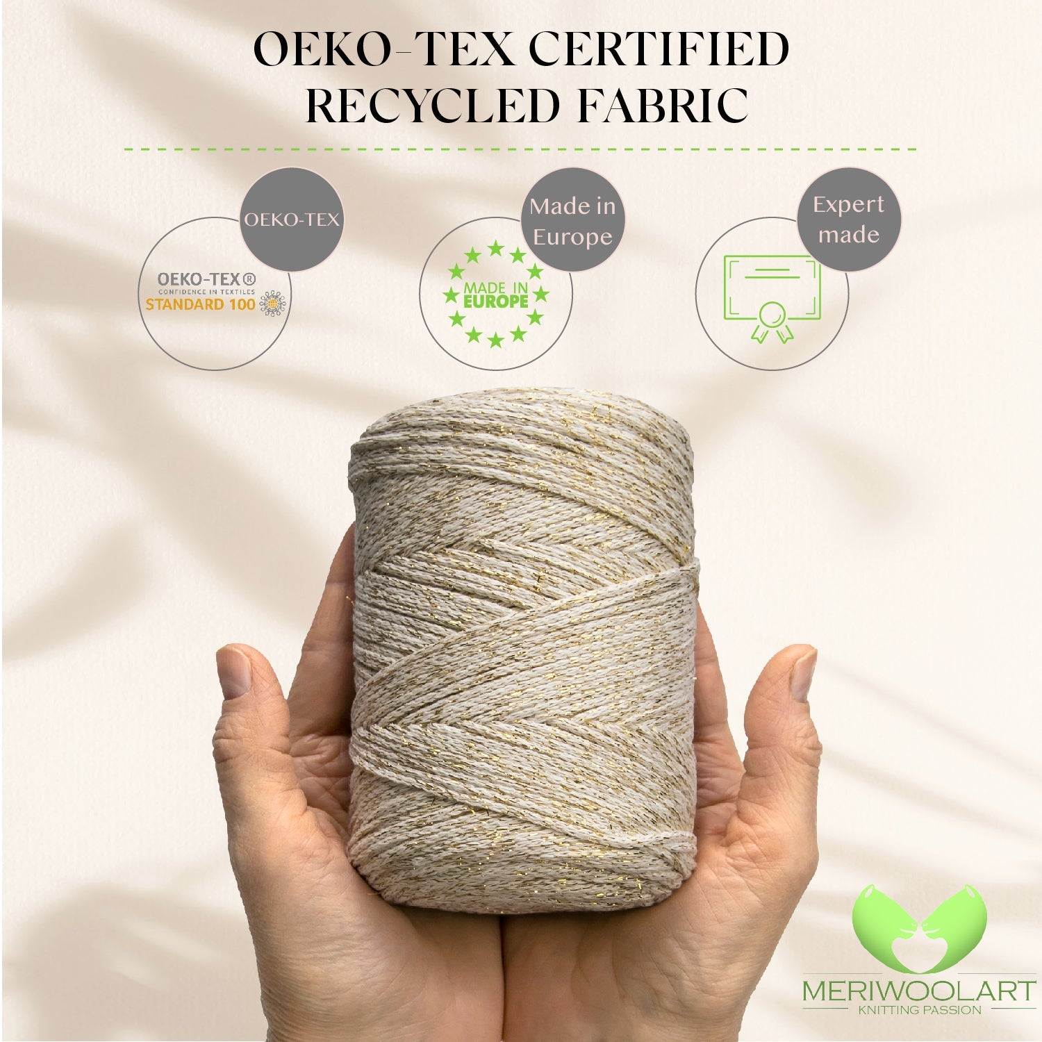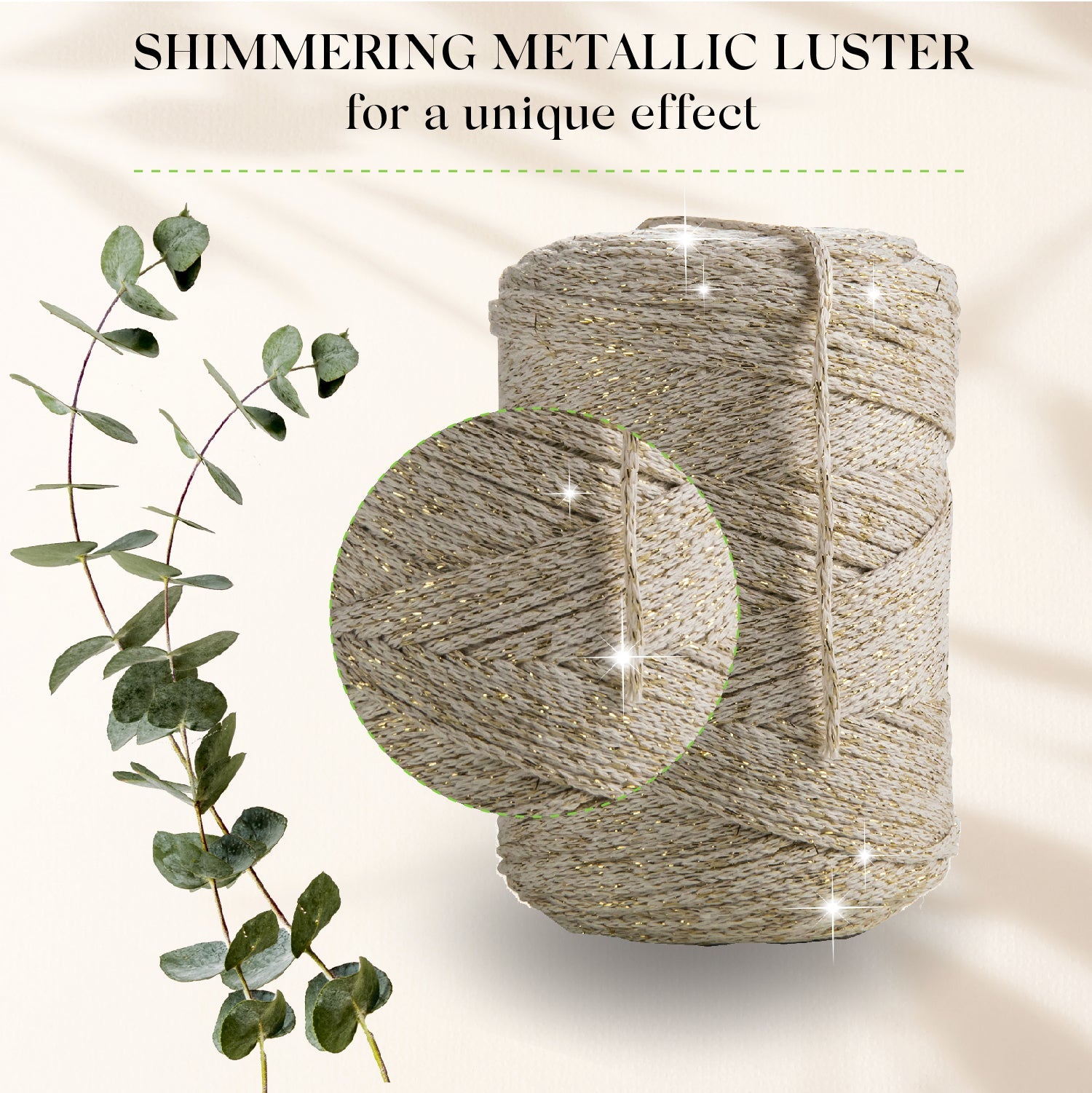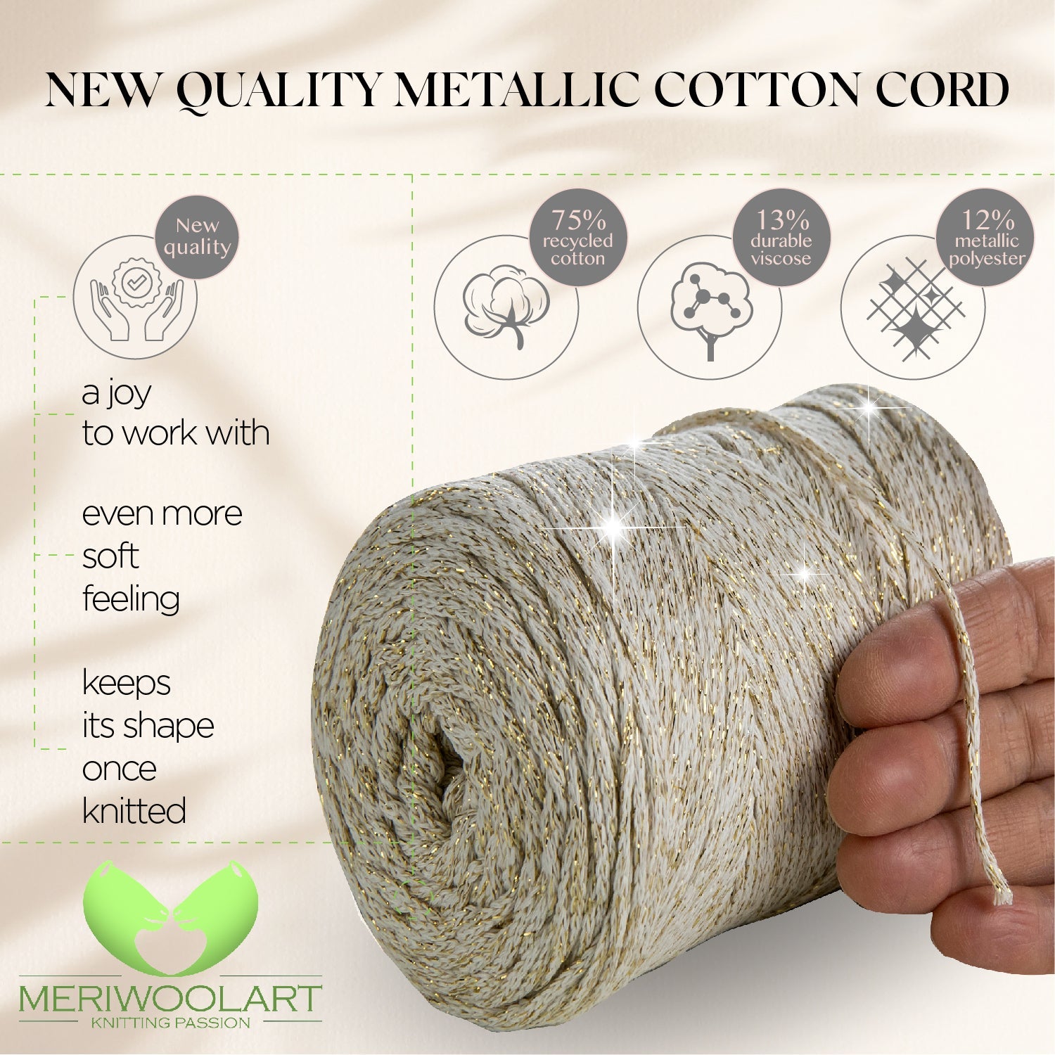 - Macramé bead string with glittering effect. Although it contains a metallic thread, the ropes with this luxury yarn are very soft and lush.