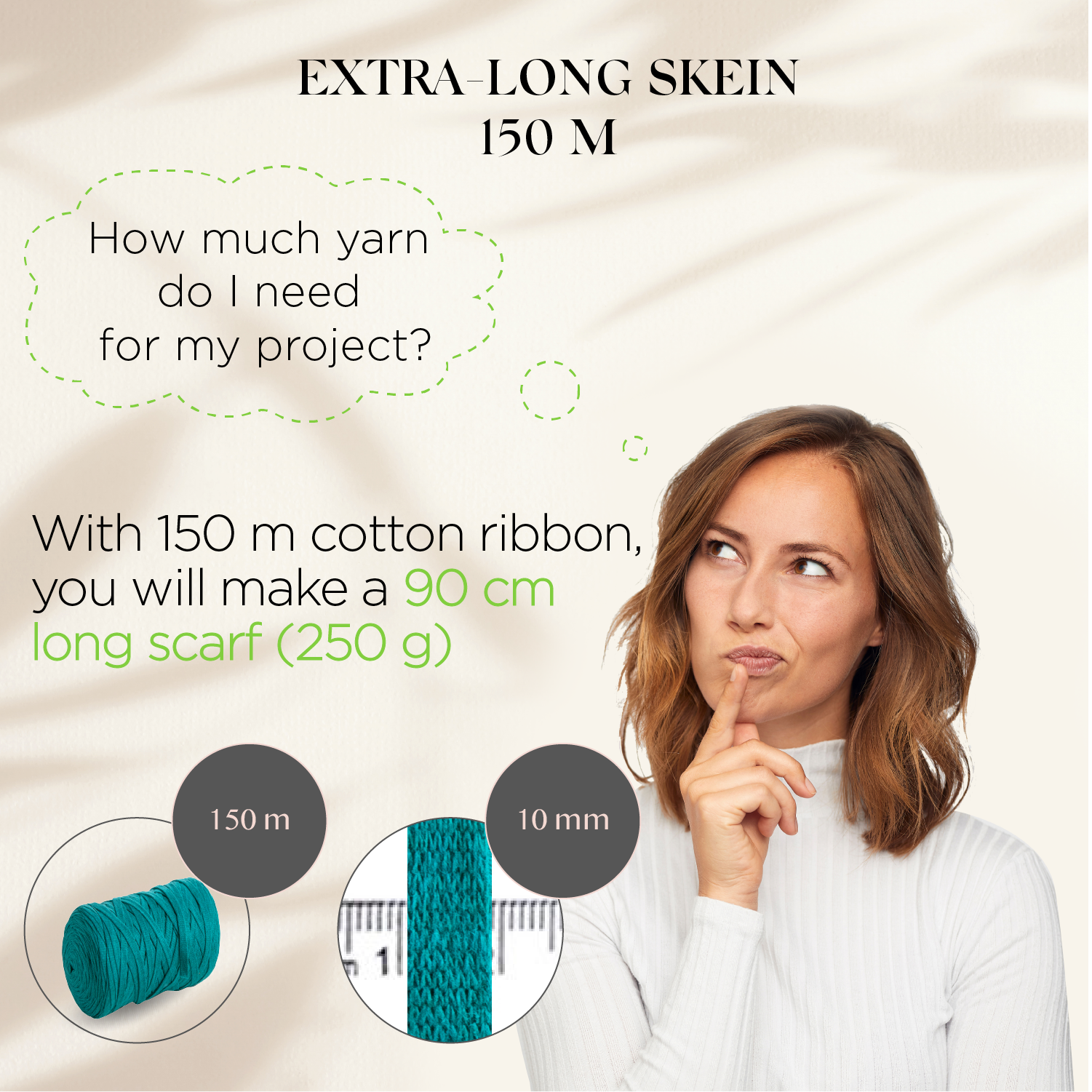 - Extra long strand 150 m cotton T-Shirt yarn.