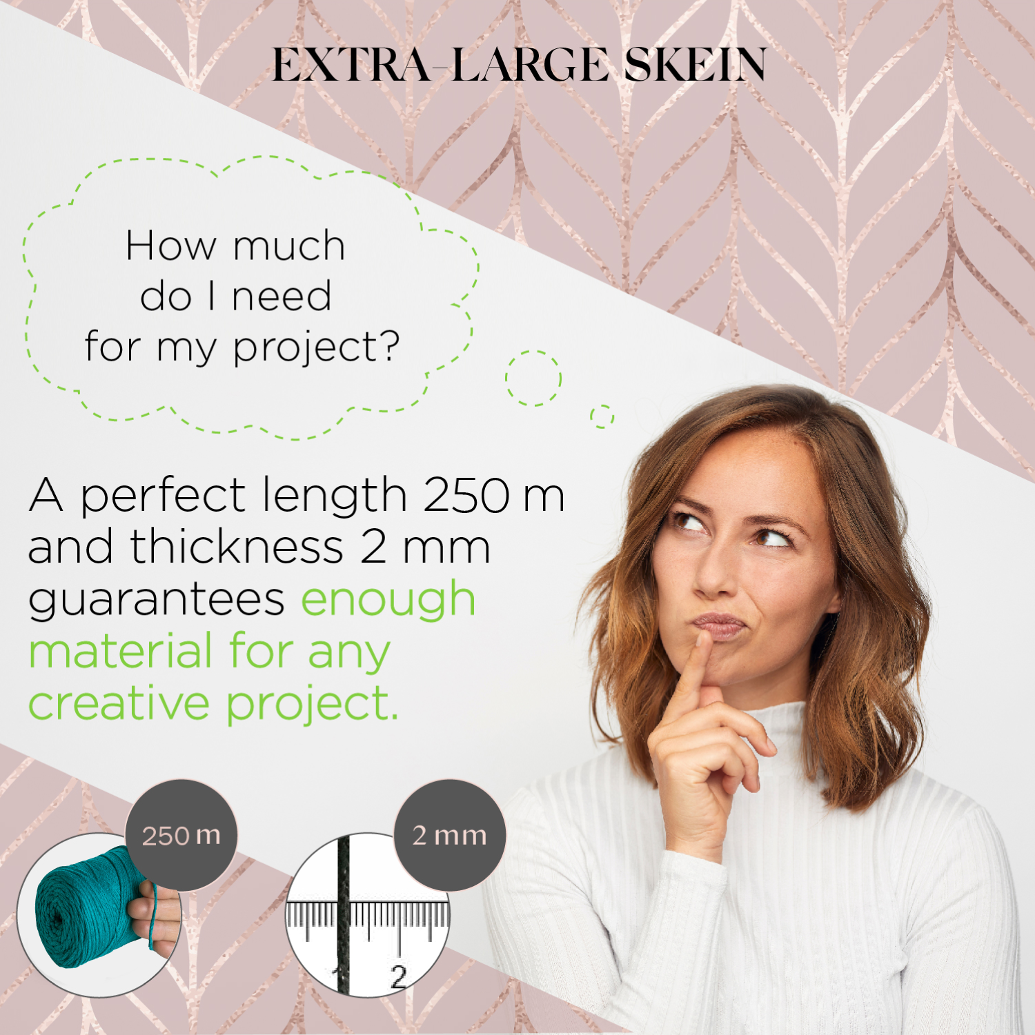- Perfect for large projects, like a crochet bag or macramé pillow. The thick cord is made of three layers, making it durable, elastic and sustainable.