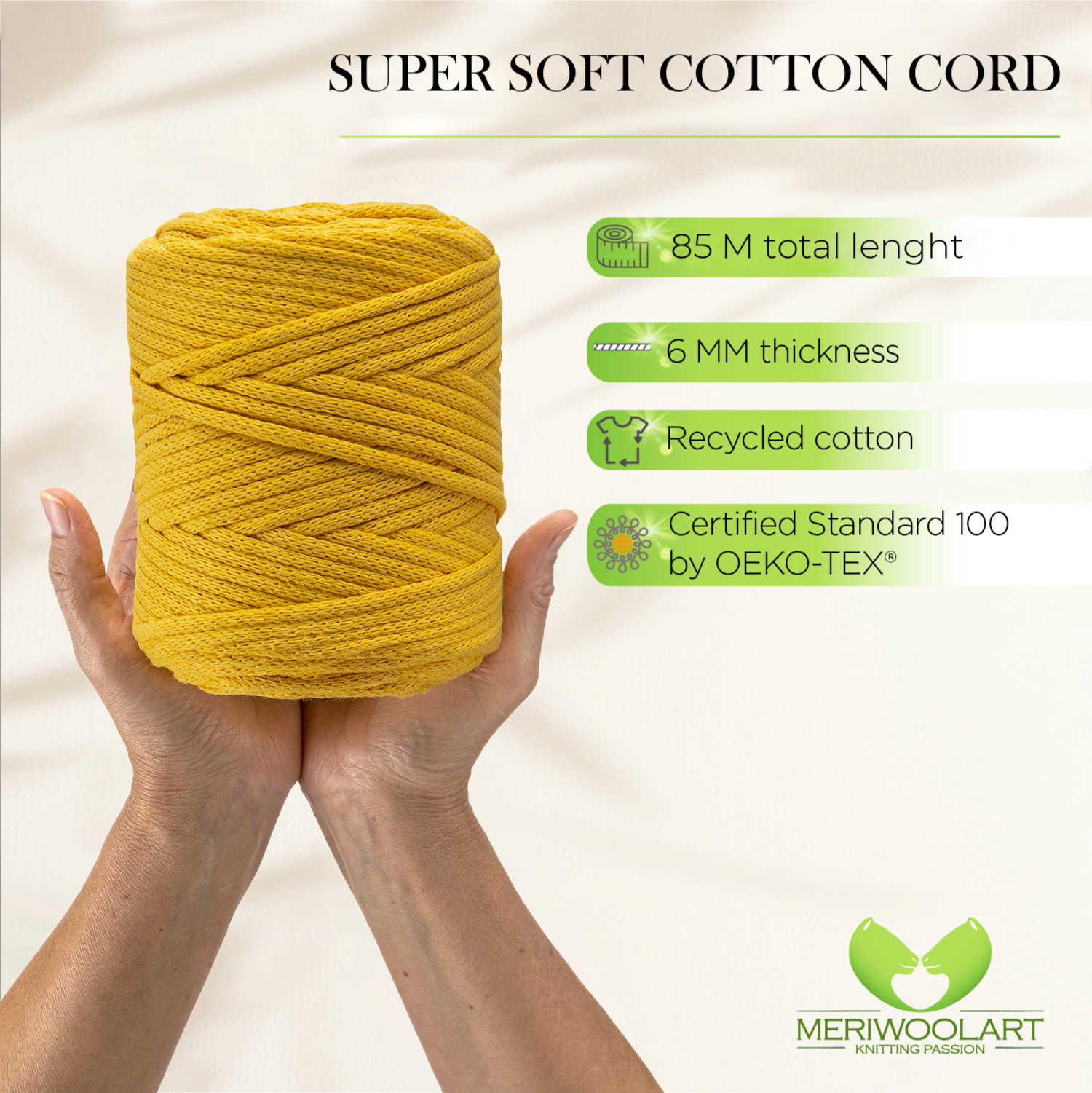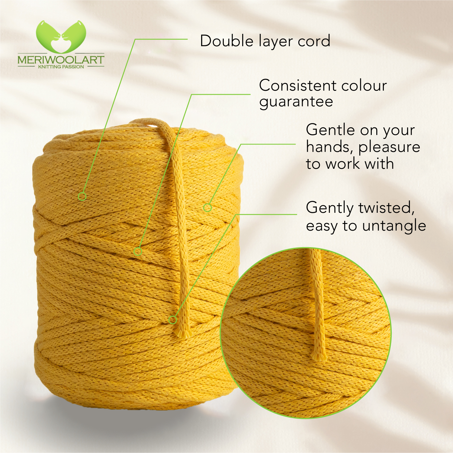 - Perfect for large projects, like a crochet bag or macramé pillow. The thick cord is made of two layers, making it durable, elastic and sustainable.
