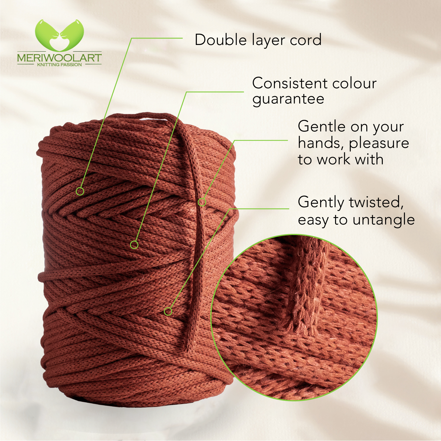 - Perfect for large projects, like a crochet bag or macramé pillow. The thick cord is made of two layers, making it durable, elastic and sustainable.
