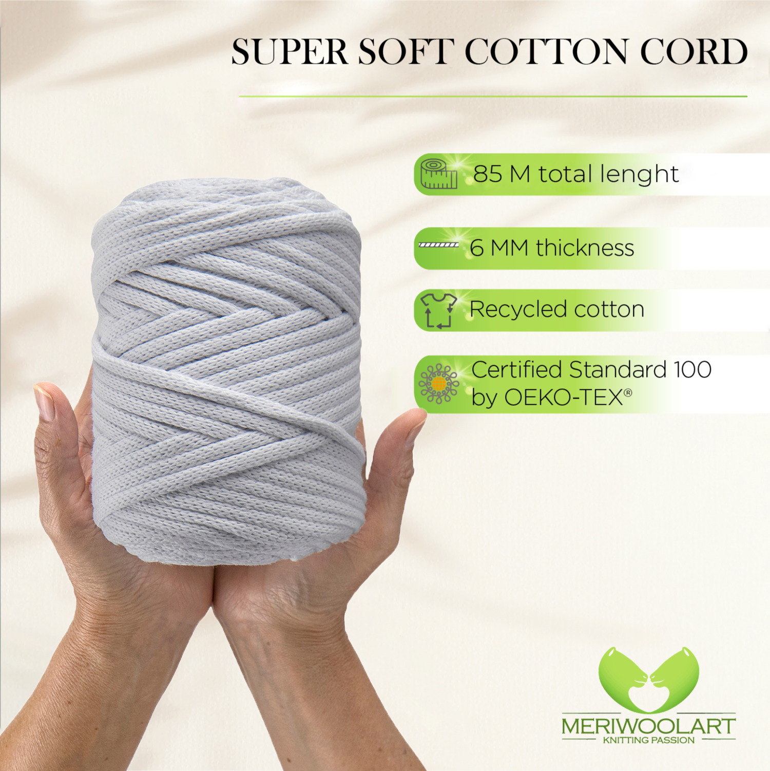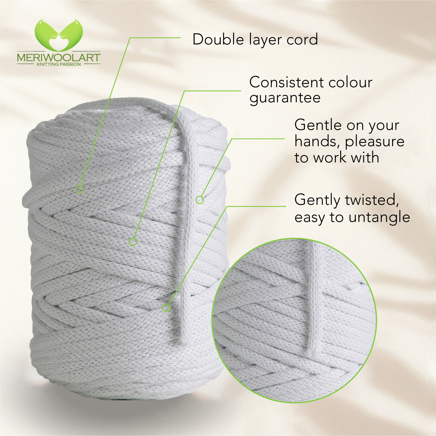 - Perfect for large projects, like a crochet bag or macramé pillow. The thick cord is made of two layers, making it durable, elastic and sustainable.