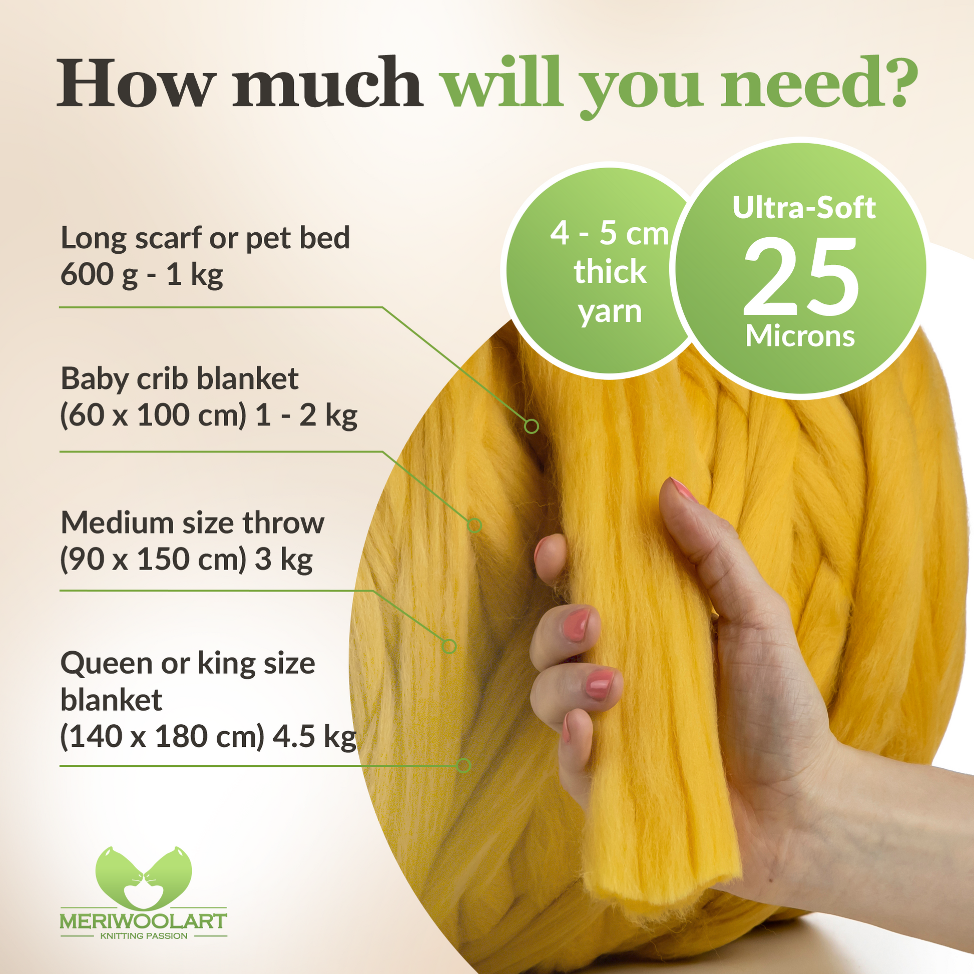- Especially thick and soft 25 micron merino wool yarn.