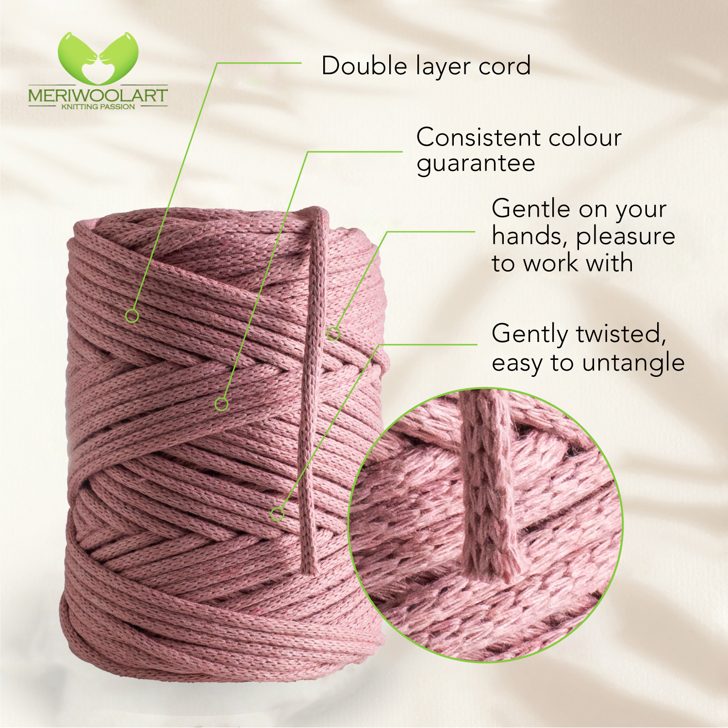 - Perfect for large projects, like a crochet bag or macramé pillow. The thick cord is made of two layers, making it durable, elastic and sustainable.