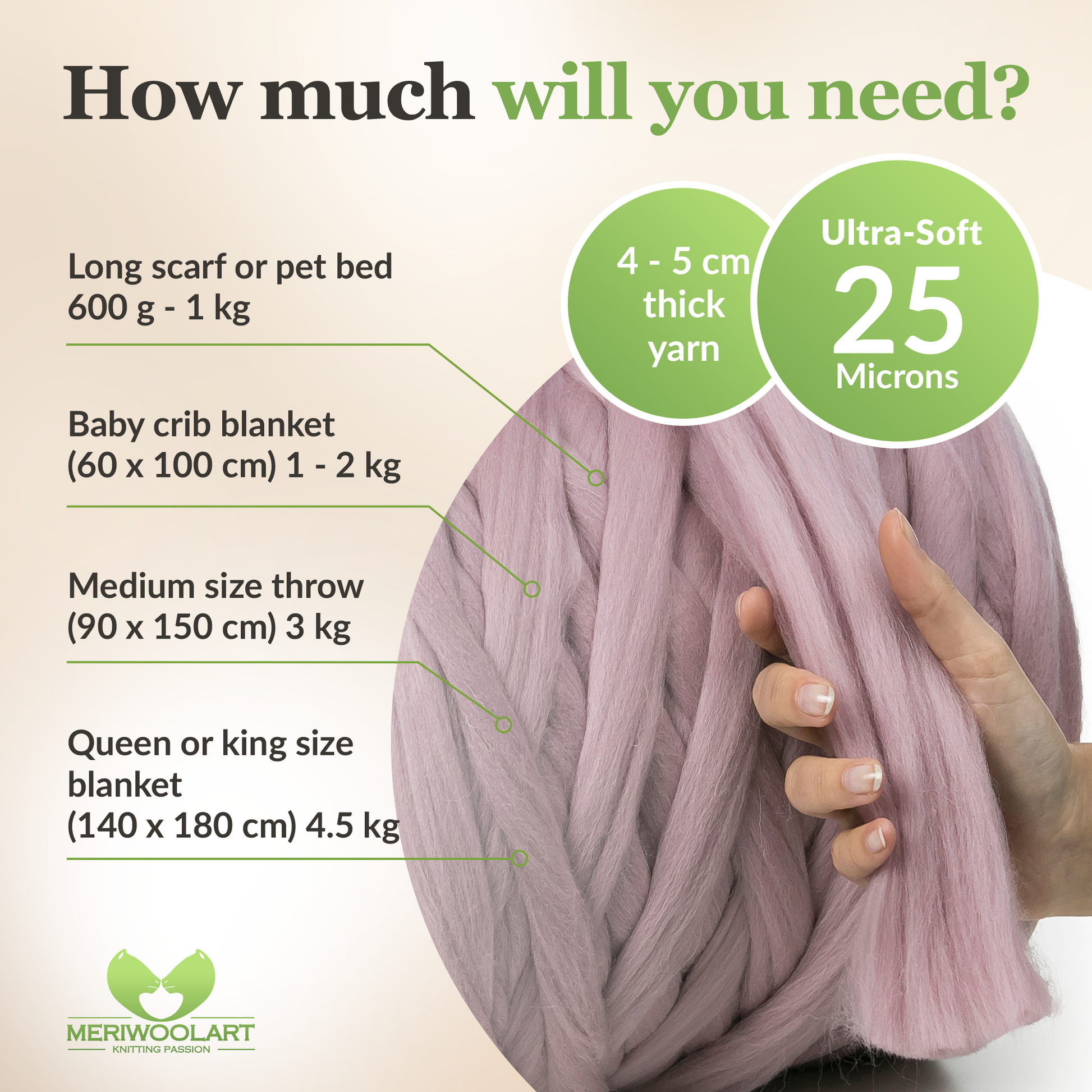 - Especially thick and soft 25 micron merino wool yarn.
