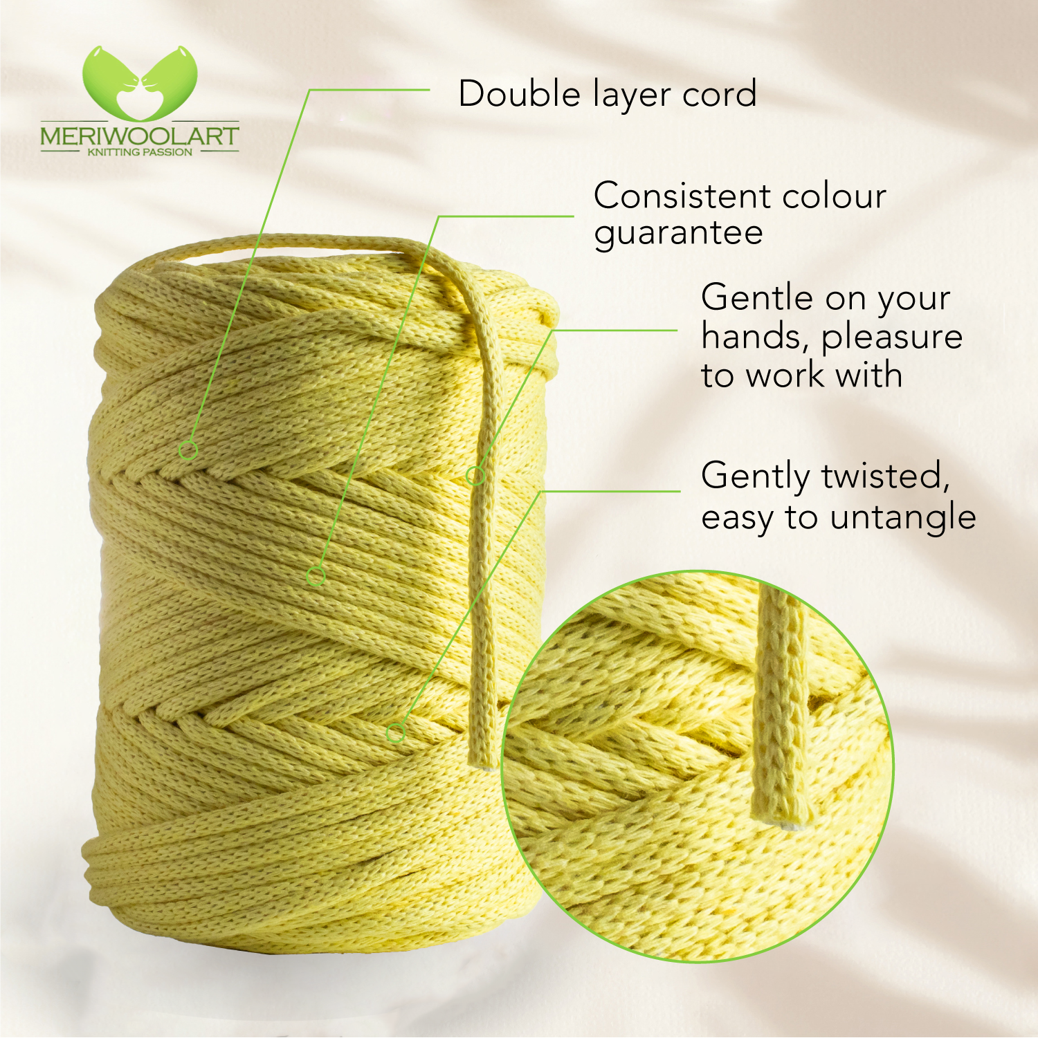 - Perfect for large projects, like a crochet bag or macramé pillow. The thick cord is made of two layers, making it durable, elastic and sustainable.